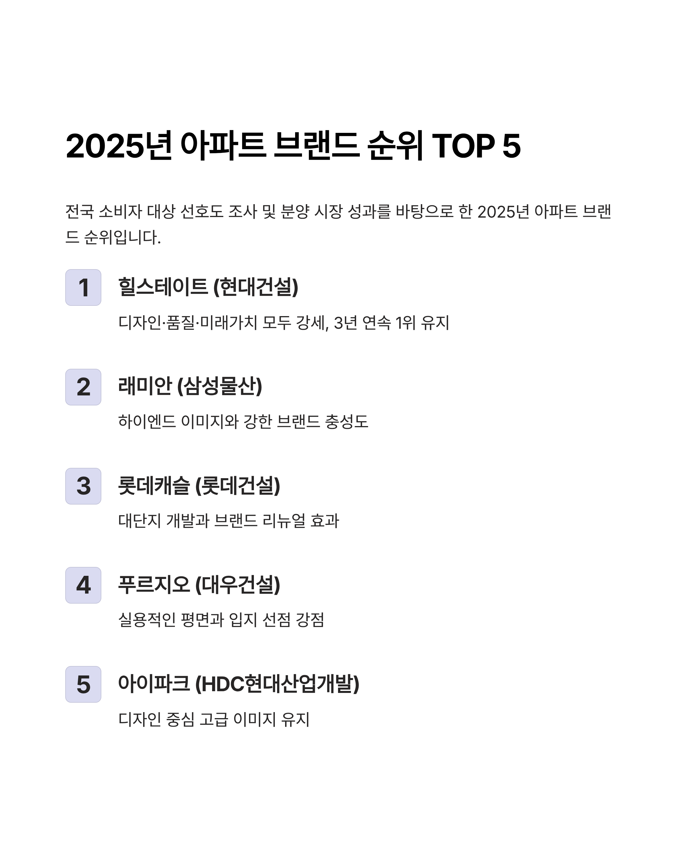 순위 브랜드명 주요 특징 1위 힐스테이트 현대건설, 디자인·품질·미래가치 모두 강세 2위 래미안 삼성물산, 하이엔드 이미지와 강한 브랜드 충성도 3위 롯데캐슬 롯데건설, 대단지 개발과 브랜드 리뉴얼 효과 4위 푸르지오 대우건설, 실용적인 평면과 입지 선점 강점 5위 아이파크 HDC현대산업개발, 디자인 중심 고급 이미지 유지