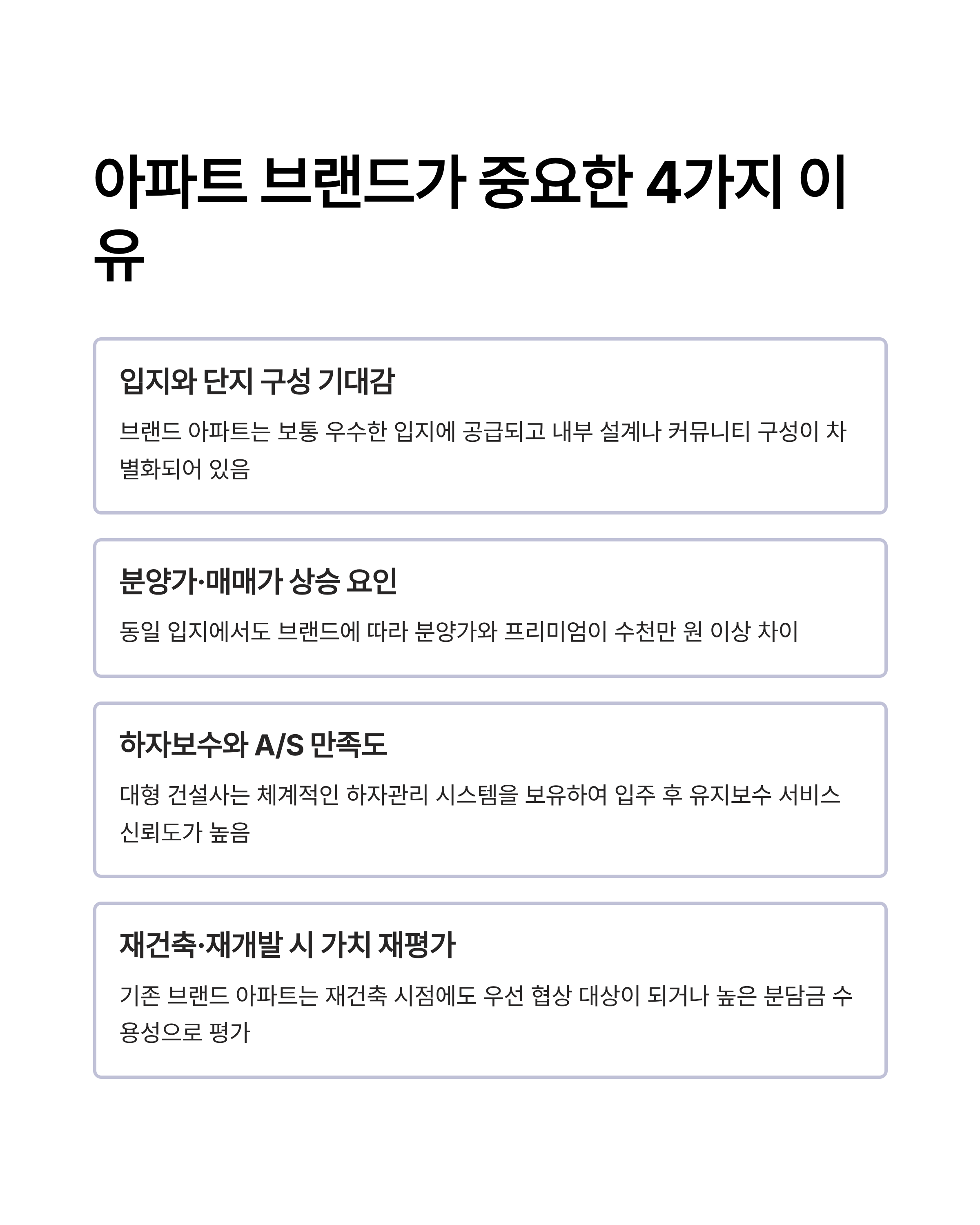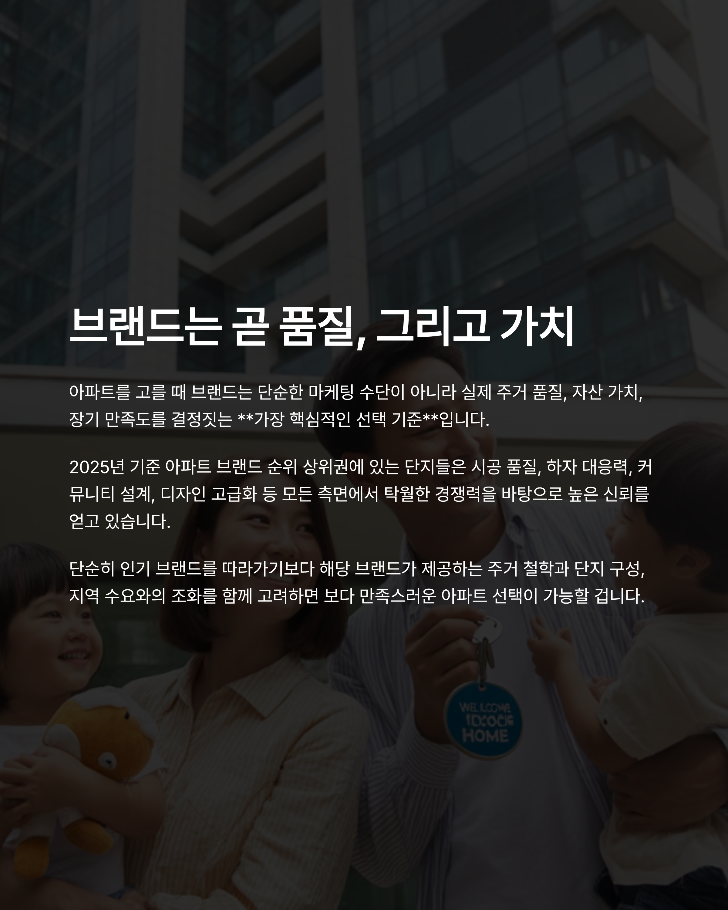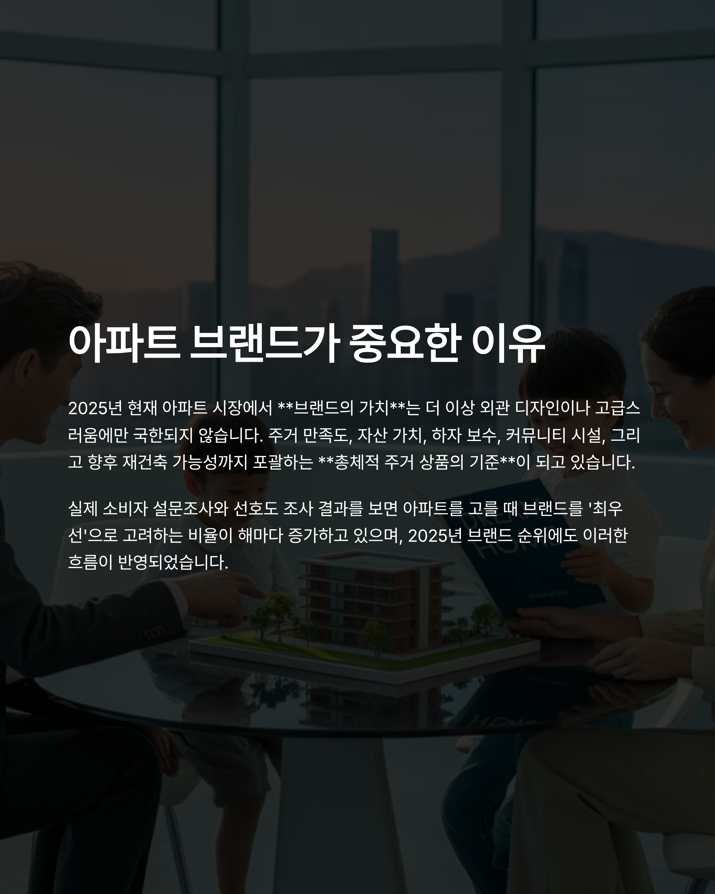 아파트를 고를 때 브랜드는 단순한 마케팅 수단이 아니라 실제 주거 품질, 자산 가치, 장기 만족도를 결정짓는 가장 핵심적인 선택 기준입니다.