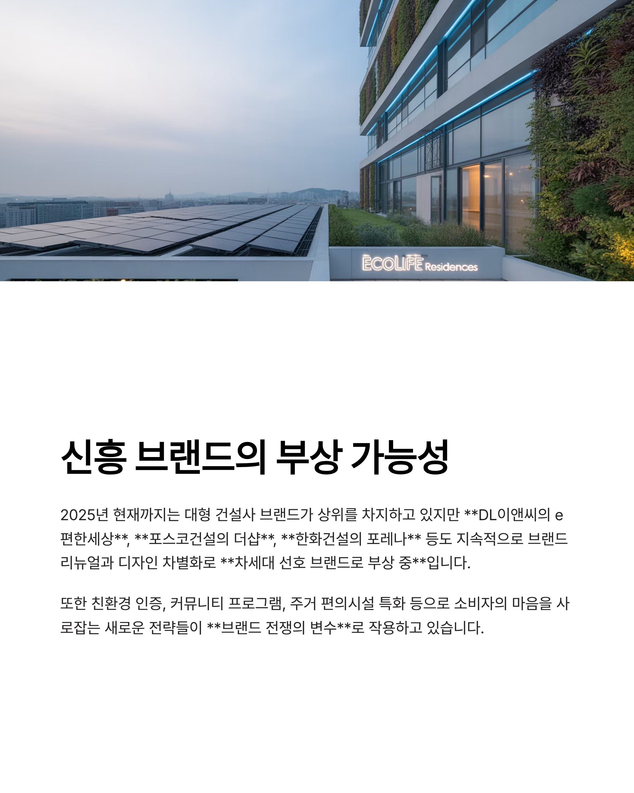 또한 친환경 인증, 커뮤니티 프로그램, 주거 편의시설 특화 등으로 소비자의 마음을 사로잡는 새로운 전략들이 브랜드 전쟁의 변수로 작용하고 있습니다.