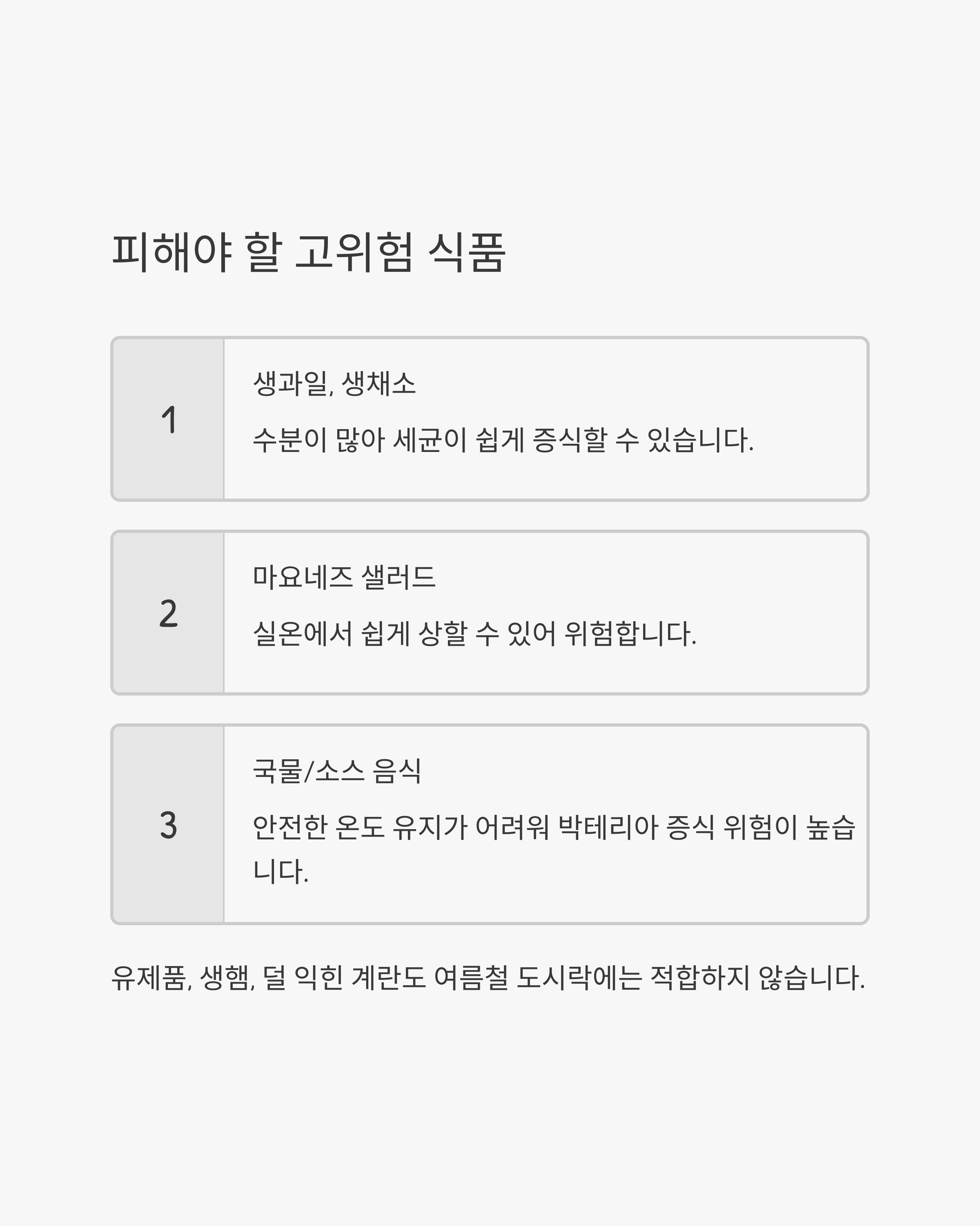 또한 유제품, 생햄, 덜 익힌 계란 등도 여름철에는 도시락에 포함시키지 않는 것이 좋습니다.