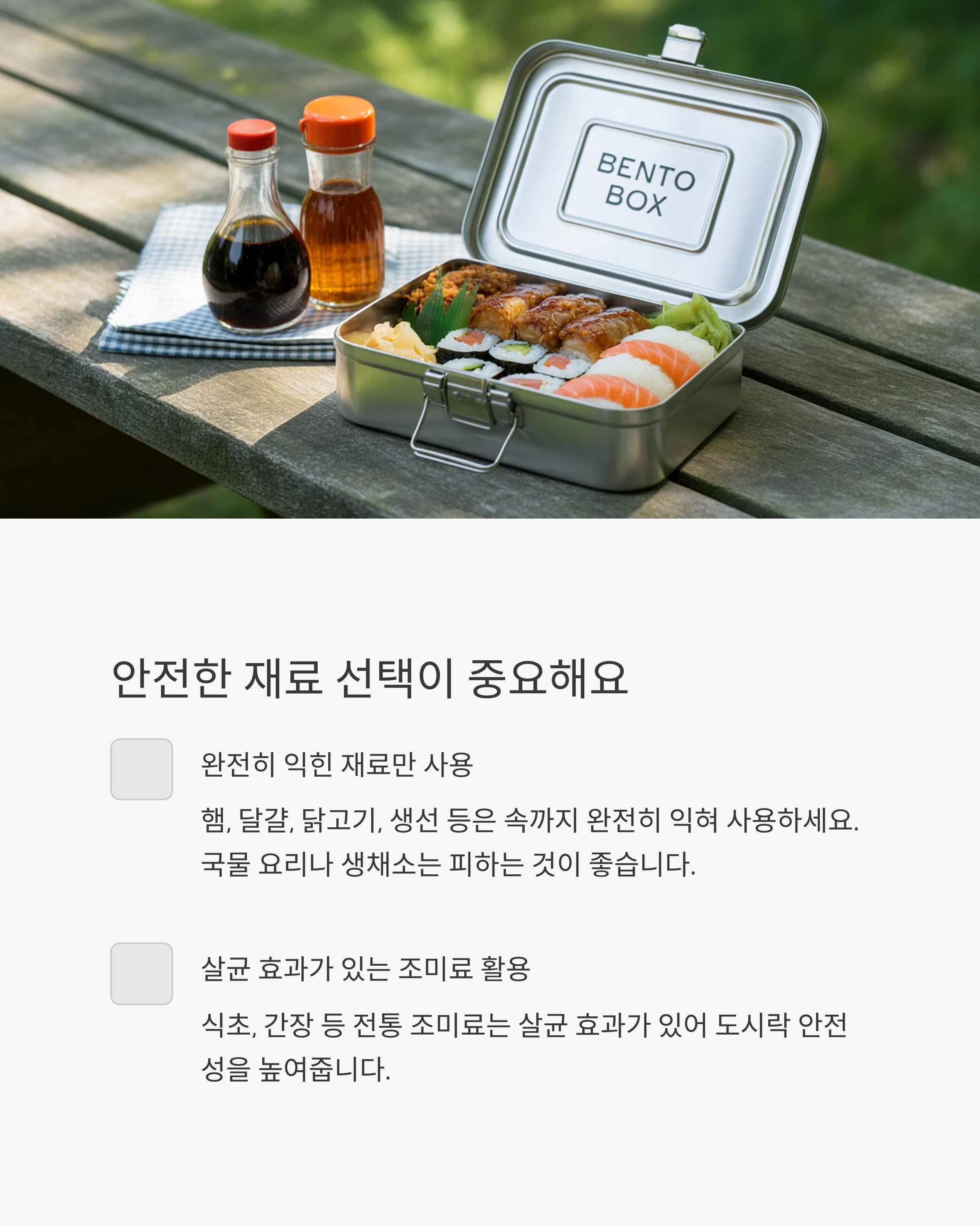 여름 도시락은 만든 날에 바로 먹는 것이 원칙입니다. 시간이 지날수록 맛뿐만 아니라 박테리아 증식 위험도 커집니다. 먹기 전에 색상, 냄새, 상태를 반드시 확인하고 조금이라도 이상이 있으면 절대 섭취하지 마세요.