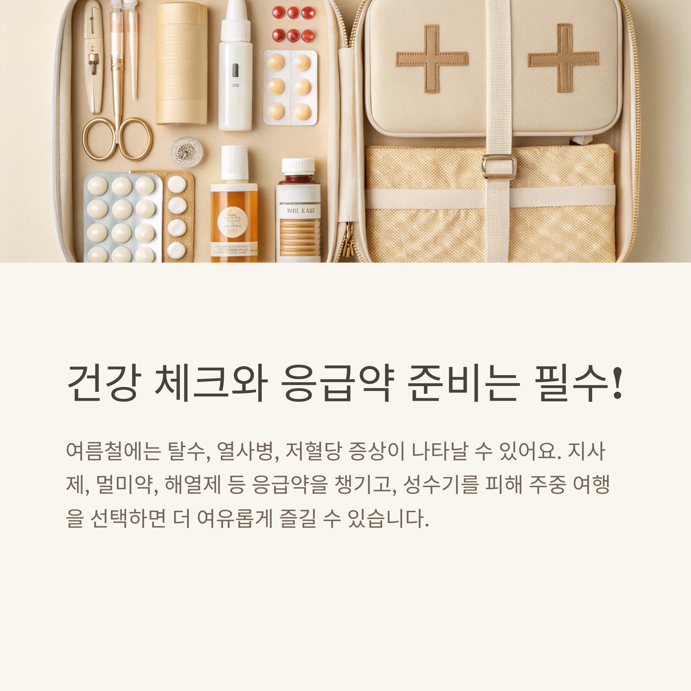 여름 여행 전 건강 체크도 잊지 마세요. 평소보다 땀이 많이 나는 여름엔 탈수, 열사병, 저혈당 증상이 나타날 수 있어요.