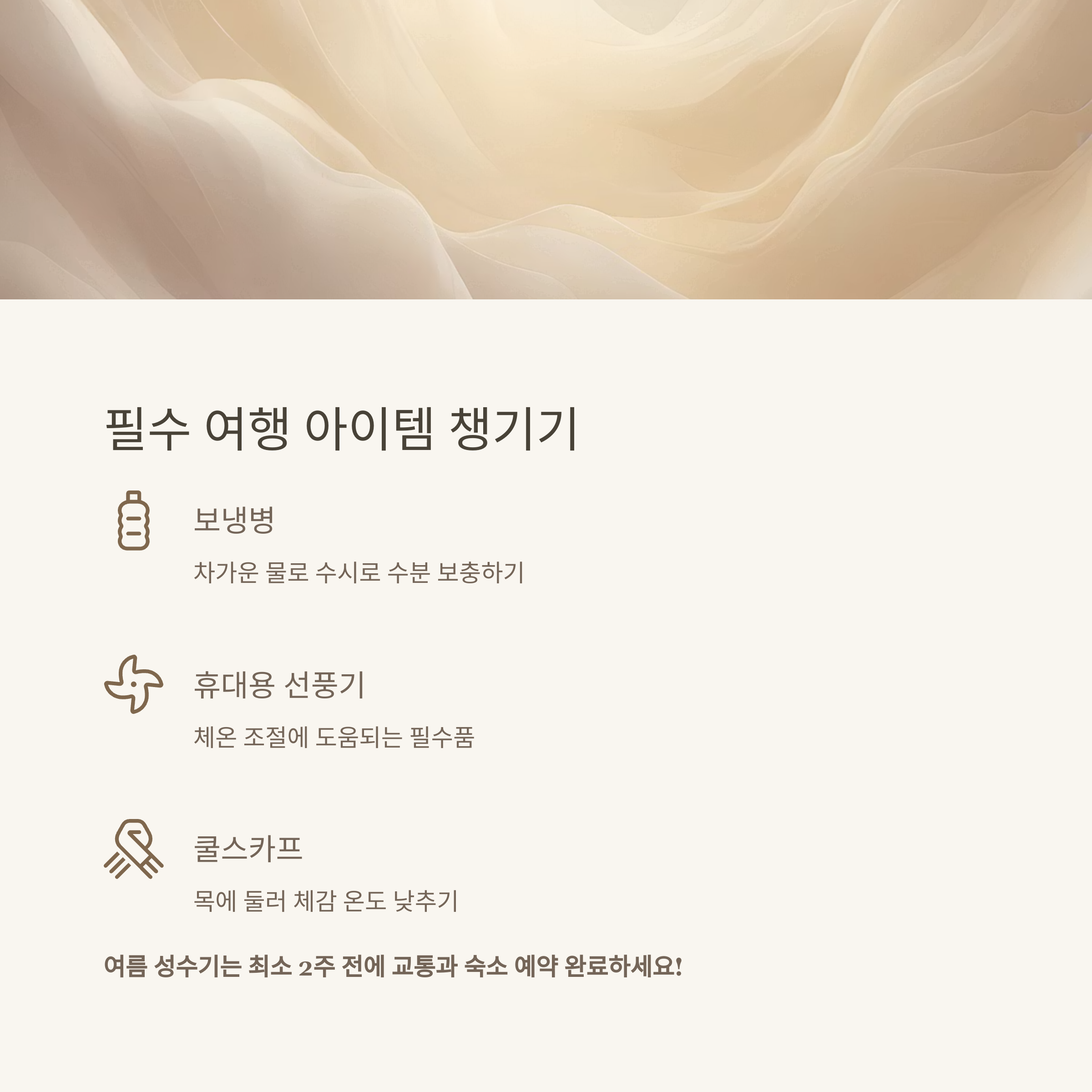 보냉병, 휴대용 선풍기, 쿨스카프, 교통·숙소 예약은 최소 2주 전