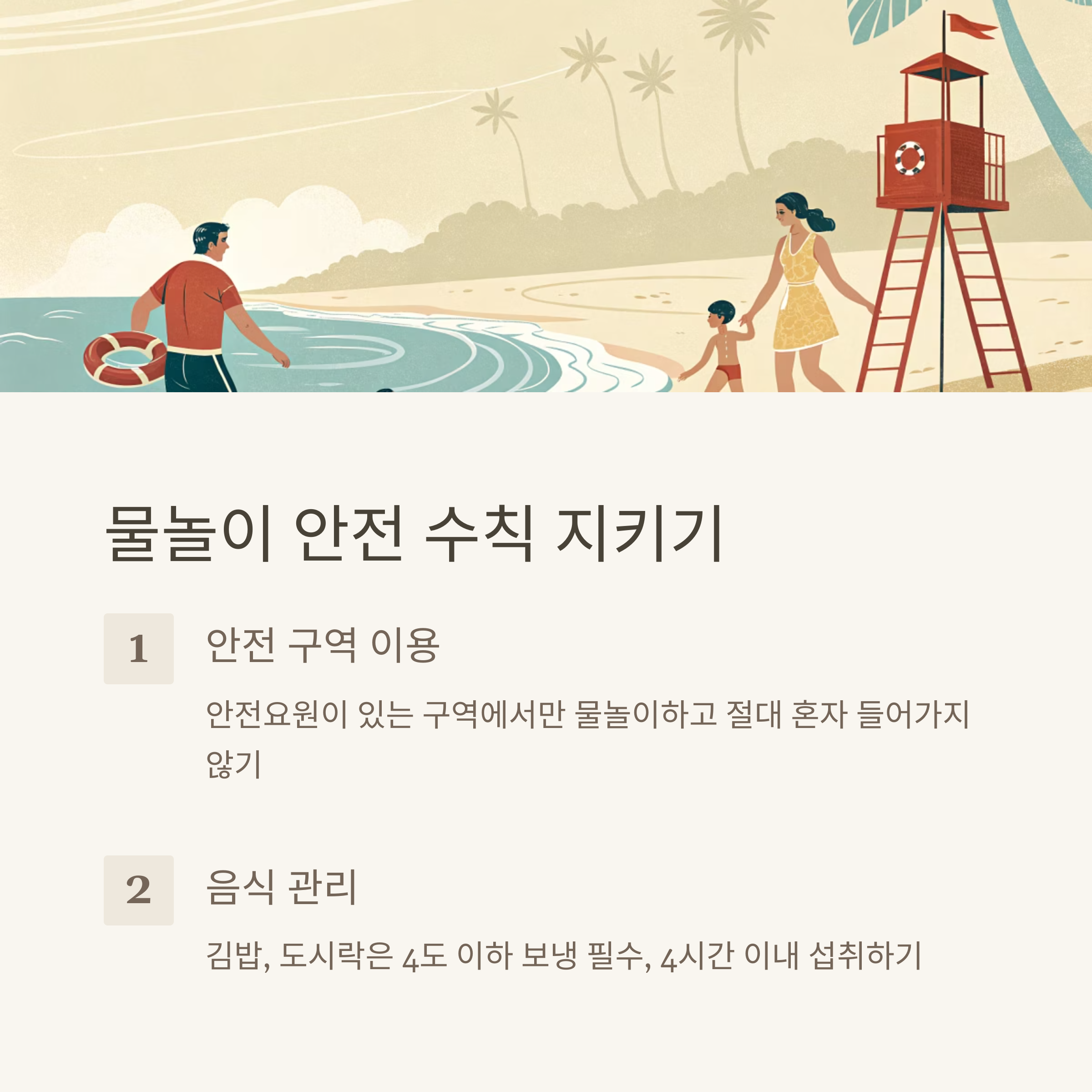 계곡과 해수욕장에서는 눈에 띄지 않는 급류나 조류, 깊은 수심 때문에 사고가 자주 발생합니다. 절대 혼자 들어가지 말고, 안전요원이 있는 구역에서만 물놀이를 즐기세요. 어린이는 구명조끼 필수이며, 갑작스런 비나 물의 색 변화를 관찰하는 주의력도 필요합니다. 여름철에는 음식이 쉽게 상하기 때문에 김밥, 도시락, 과일류는 아이스팩과 함께 보관하거나 아예 현장에서 구매하는 편이 안전합니다.