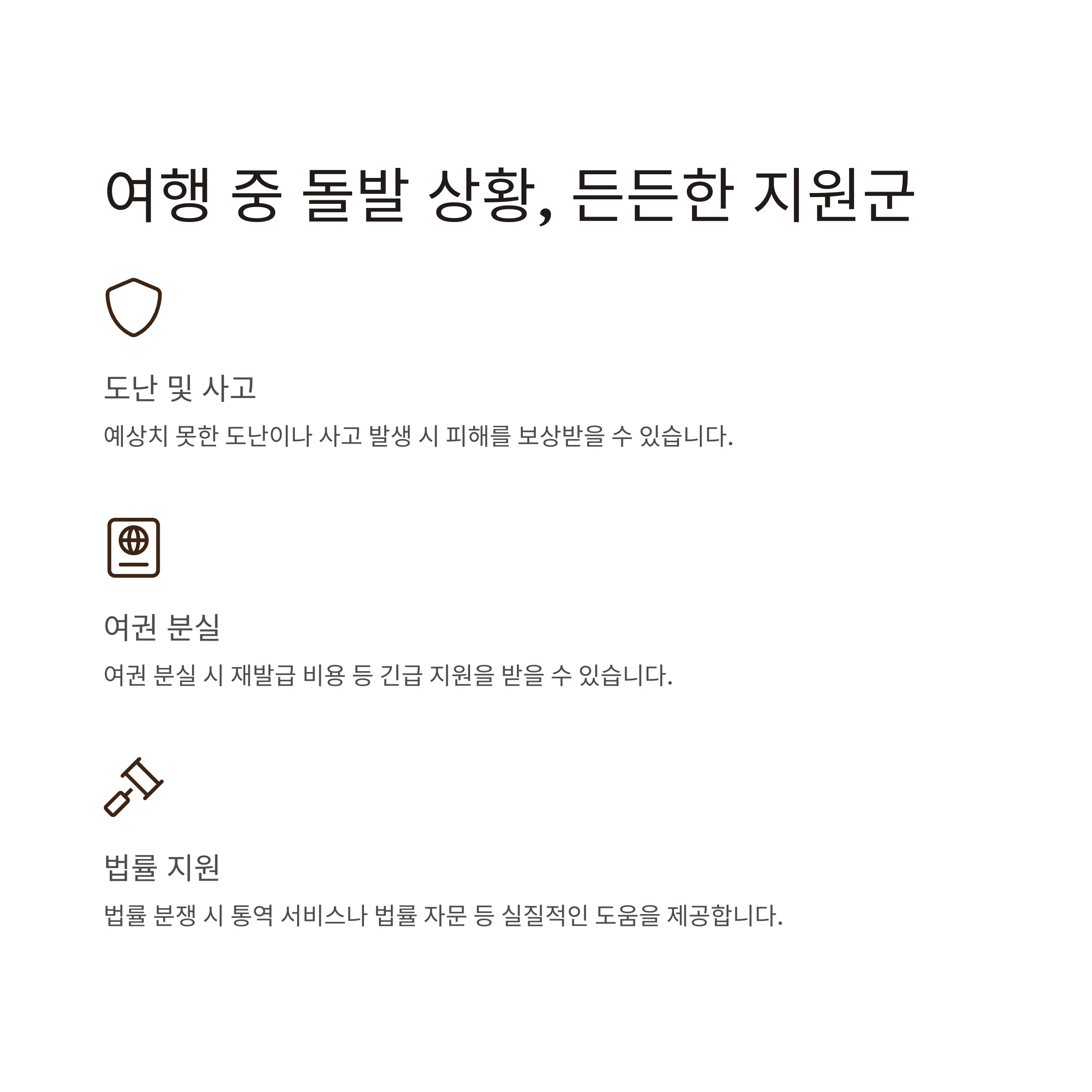 도난, 사고, 여권 분실, 심지어 법률적 분쟁까지 여행 중 일어날 수 있는 여러 돌발 상황에 대비해 법률 자문이나 통역 서비스, 긴급 구조 요청 등 다양한 지원을 받을 수 있습니다. 여행자 보험은 단순한 비용 보장 외에도 이러한 서비스를 통해 실제 여행 중 위기 상황에 실질적인 도움을 줍니다.