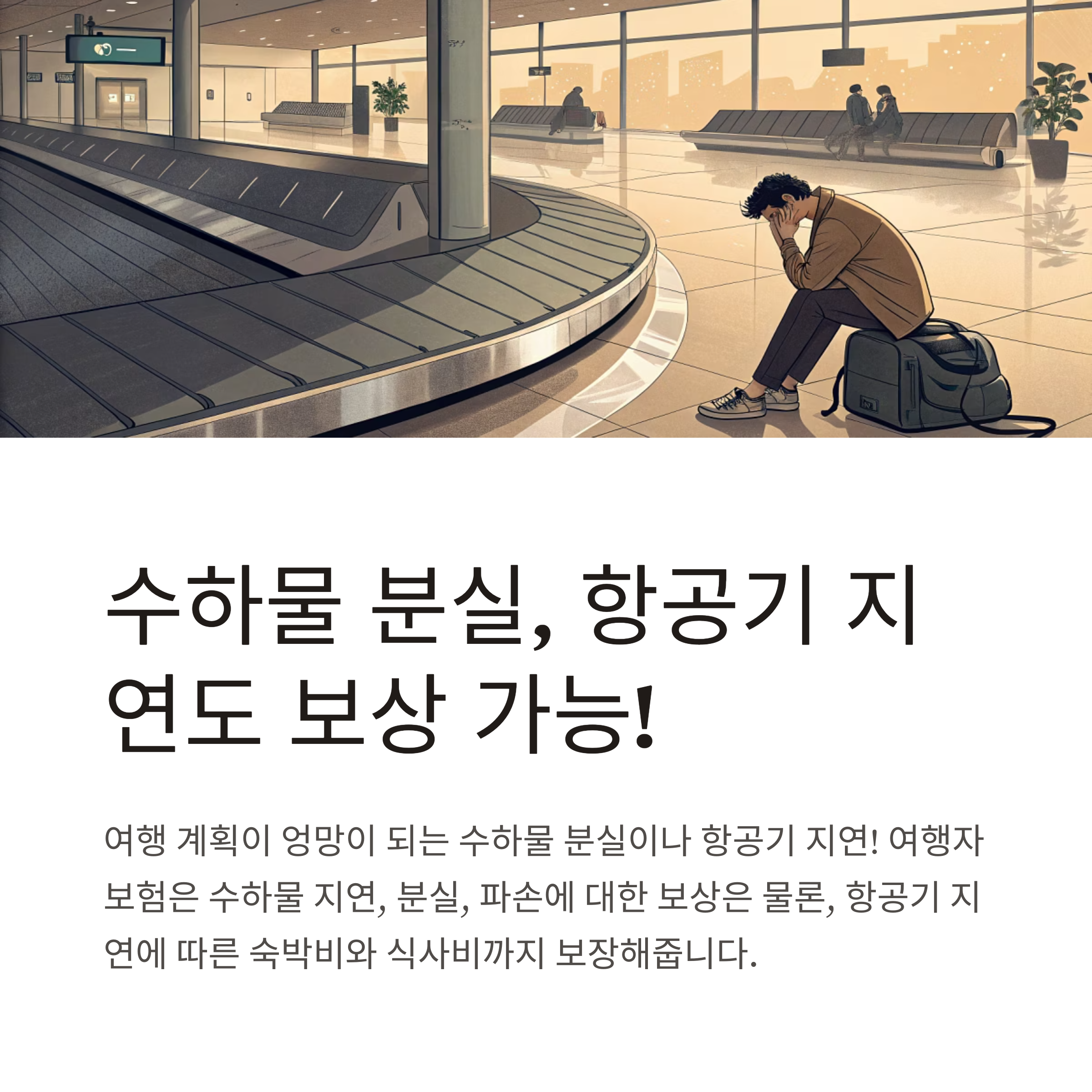 수하물이 도착하지 않거나 비행기가 연착되어 여행 계획이 엉킬 경우, 정신적 스트레스는 물론 추가 비용도 발생할 수 있습니다. 여행자 보험은 수하물 지연, 분실, 파손 등에 대한 보상을 제공하며 항공기 지연에 따른 숙박비, 식사비 등도 보장해줍니다.