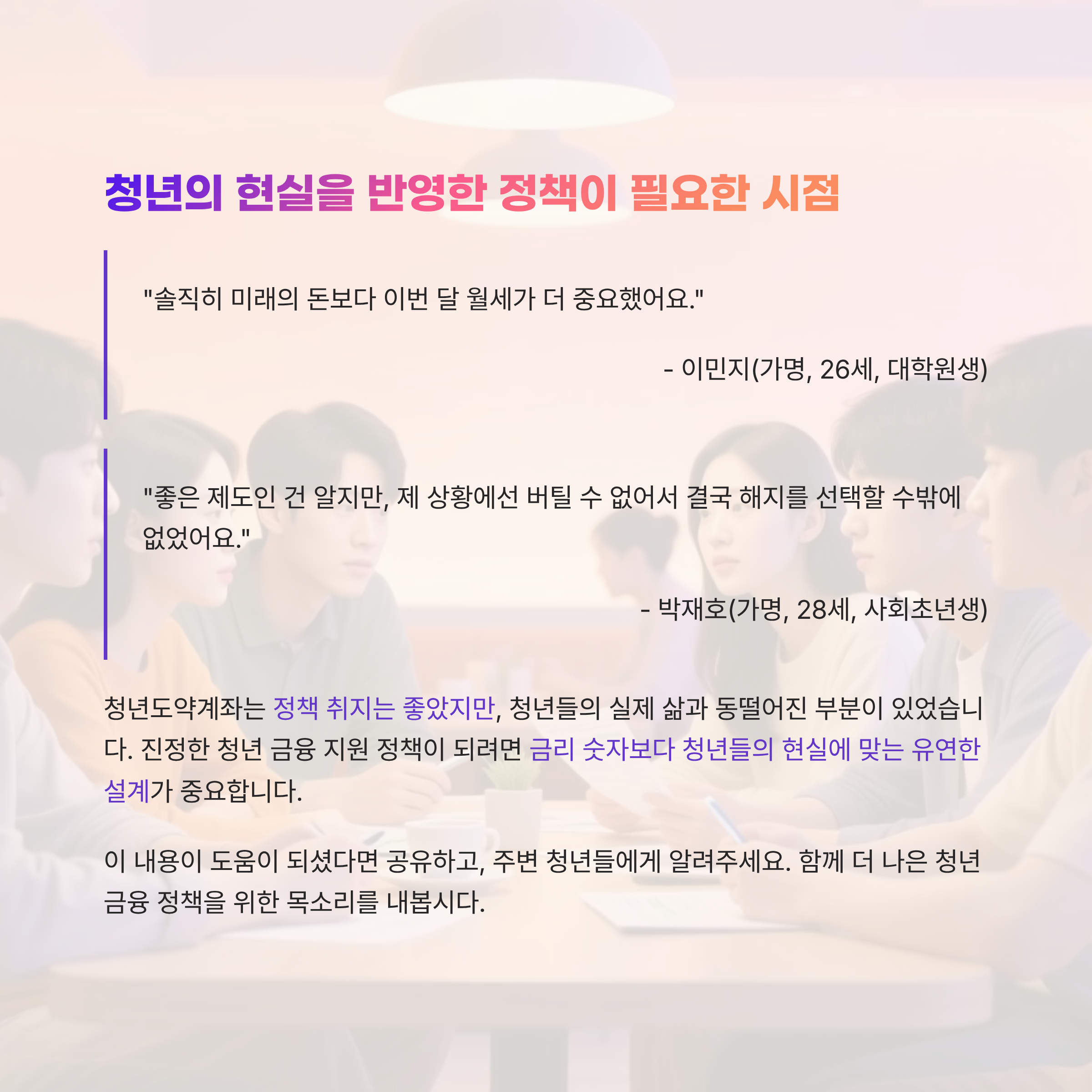 앞으로 청년 금융 상품이 진짜 도움이 되려면, 금리 숫자보다 지금 청년들의 삶과 상황에 맞는 유연한 설계가 중요하지 않을까요?