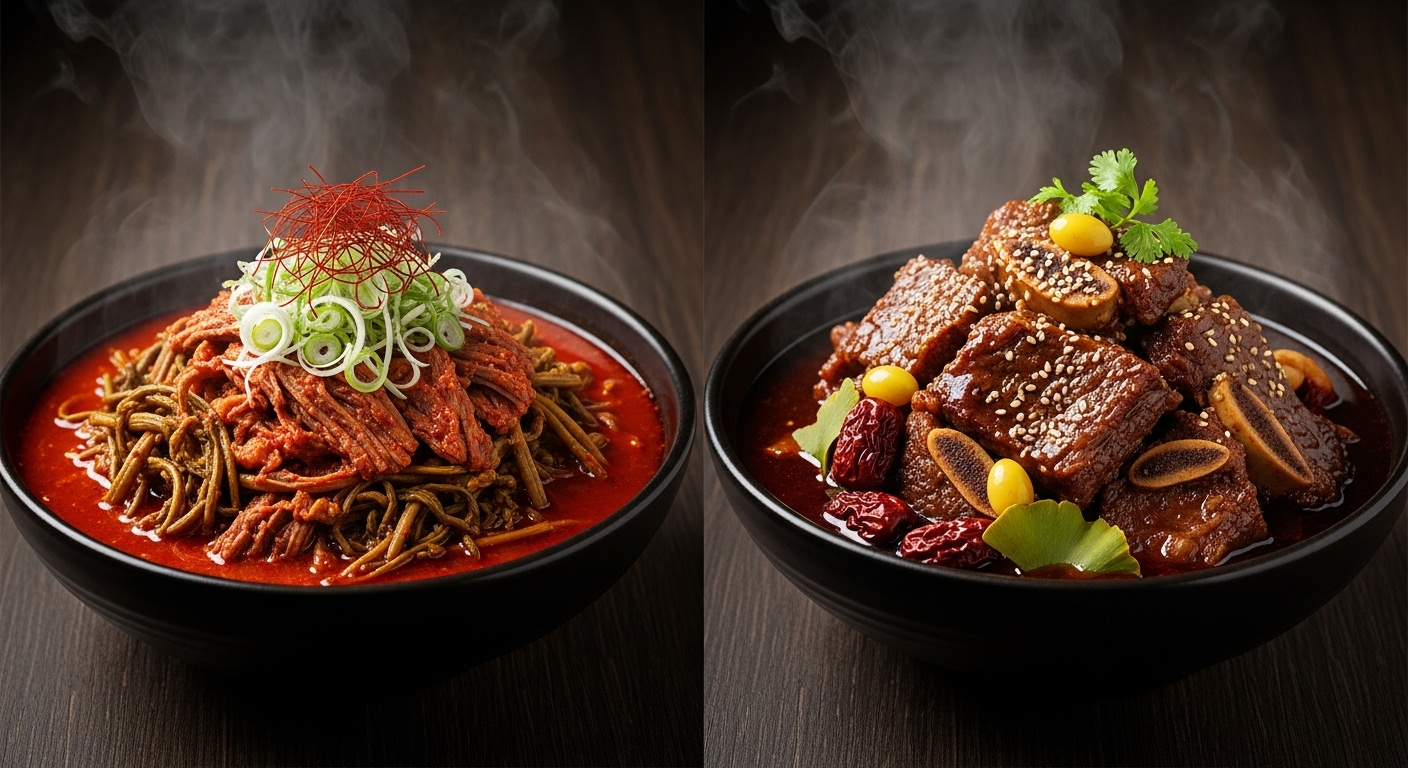 한국 매운 고기 요리의 양대 거장! 칼칼한 국물의 육개장과 윤기나는 양념의 갈비찜, 둘 다 매운맛으로 사랑받지만 그 스타일은 완전히 다릅니다. 육개장은 한국의 전통적인 매운 쇠고기 탕으로 많은 이들에게 사랑받는 음식이지만 다이어트를 하는 분들에게는 주의가 필요한 메뉴입니다. 갈비찜은 명절이나 특별한 날에 빠질 수 없는 한국의 대표 요리로, 달콤하면서도 매콤한 양념이 특징입니다. 오늘은 두 음식의 매운맛 강도부터 칼로리, 가격까지 완벽하게 비교해보겠습니다.