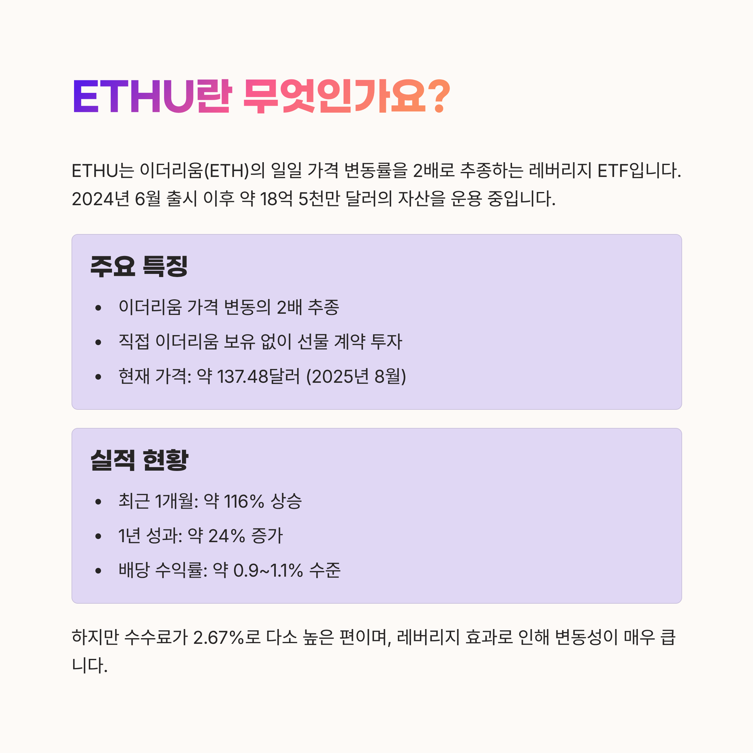 요약하자면, ETHU는 이더리움의 일일 변동성을 두 배로 추종하는 고위험·고수익 레버리지 ETF로서,