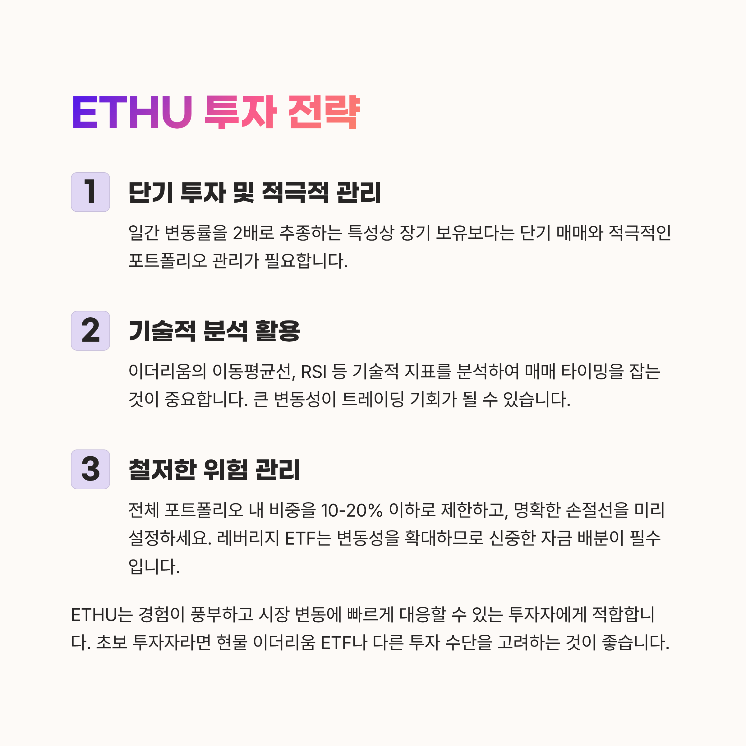 ETHU 투자 시에는 이더리움의 단기 기술적 지표(이동평균선, RSI 등)를 분석해 매매 타이밍을 잡는 것이 중요합니다. 큰 변동성이 오히려 트레이딩 기회가 될 수 있습니다. - 분산 투자 및 손절선 설정 권장