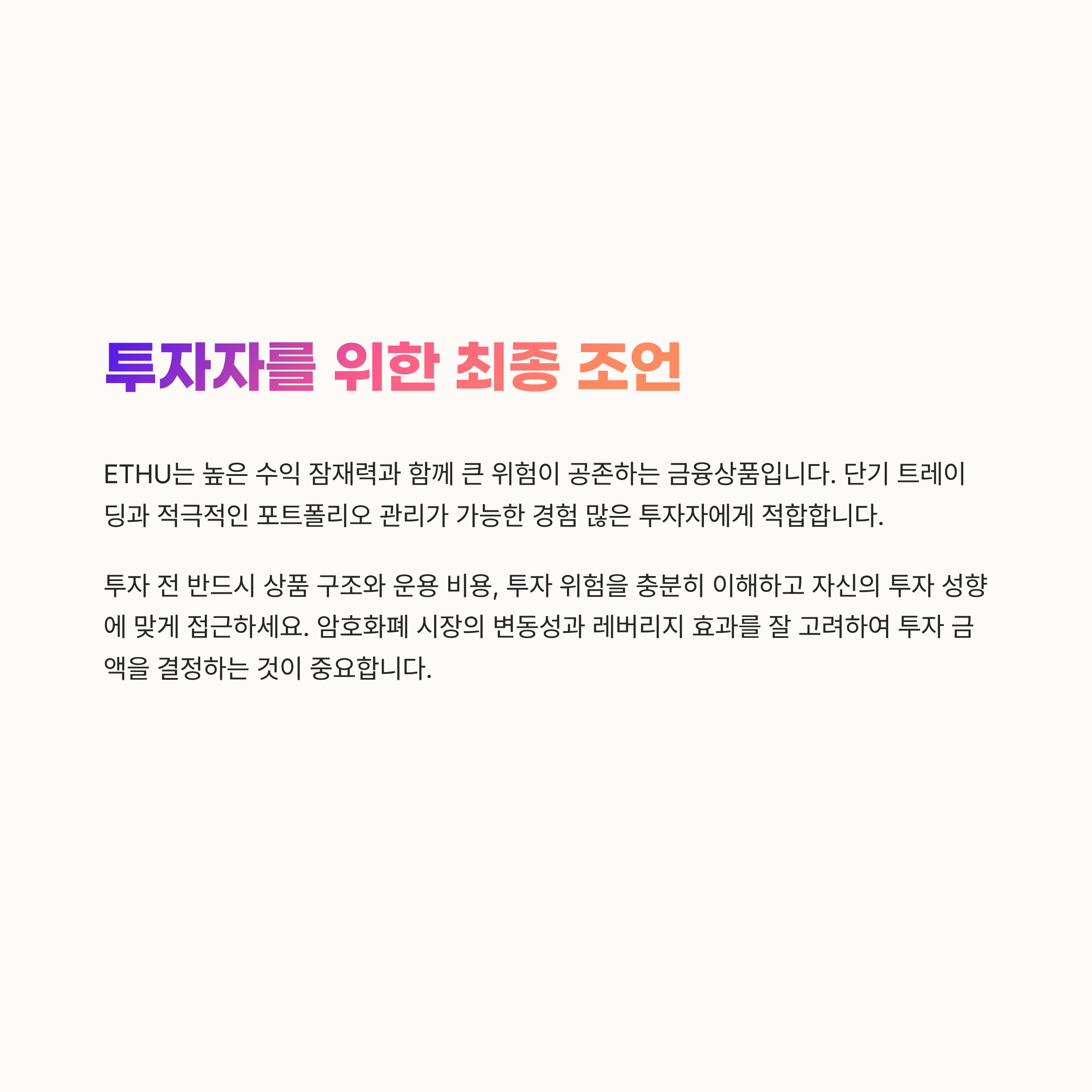 - 변동성 확보: 암호화폐 시장 특성상 단기 급변동이 빈번하며, ETHU는 그 영향이 더욱 증폭되는 구조임을 유념해야 합니다.