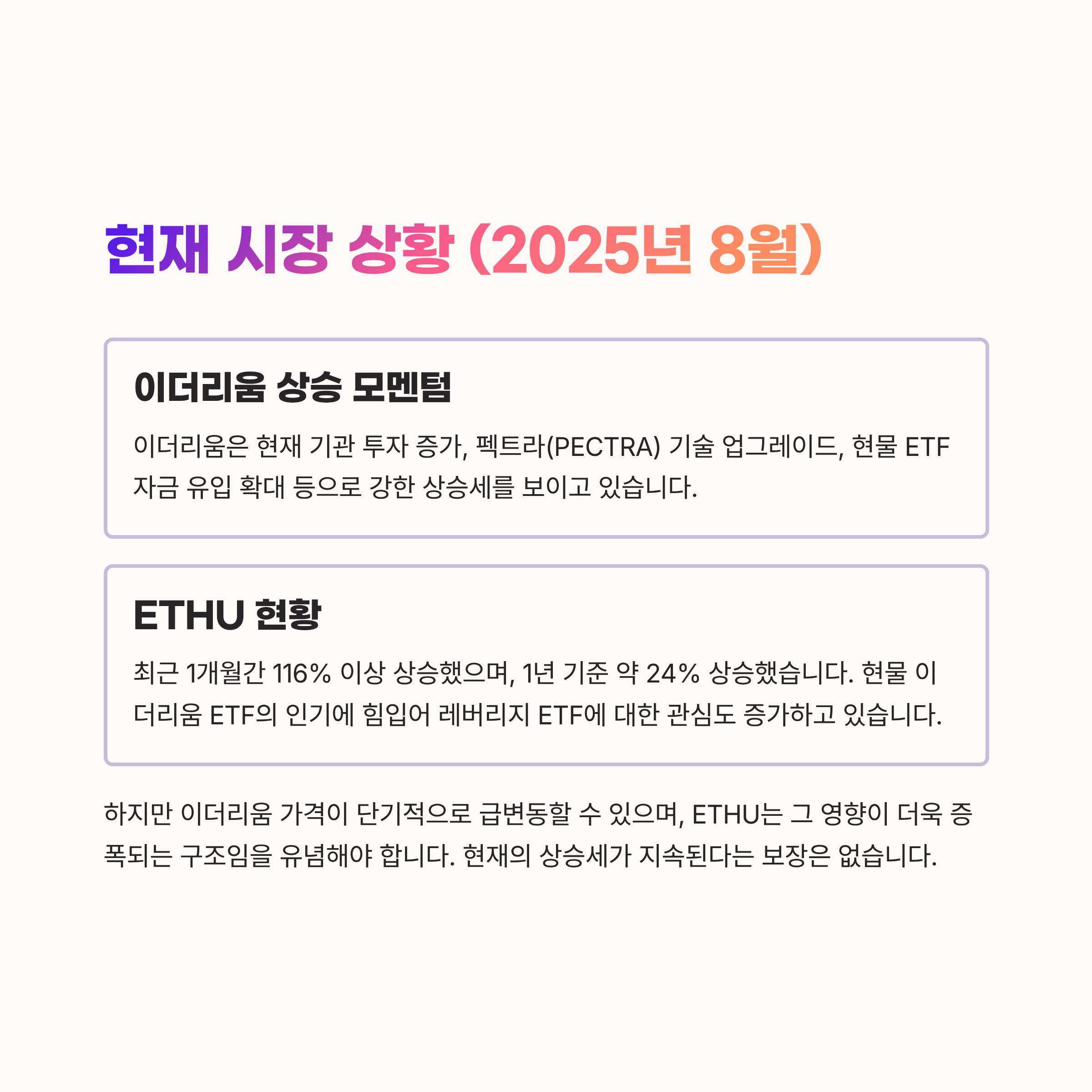 - ETF 시장 동향: 현물 이더리움 ETF가 큰 폭의 자금 유입을 기록하면서, ETHU 같은 레버리지 ETF에 대한 관심도 덩달아 커지고 있습니다.