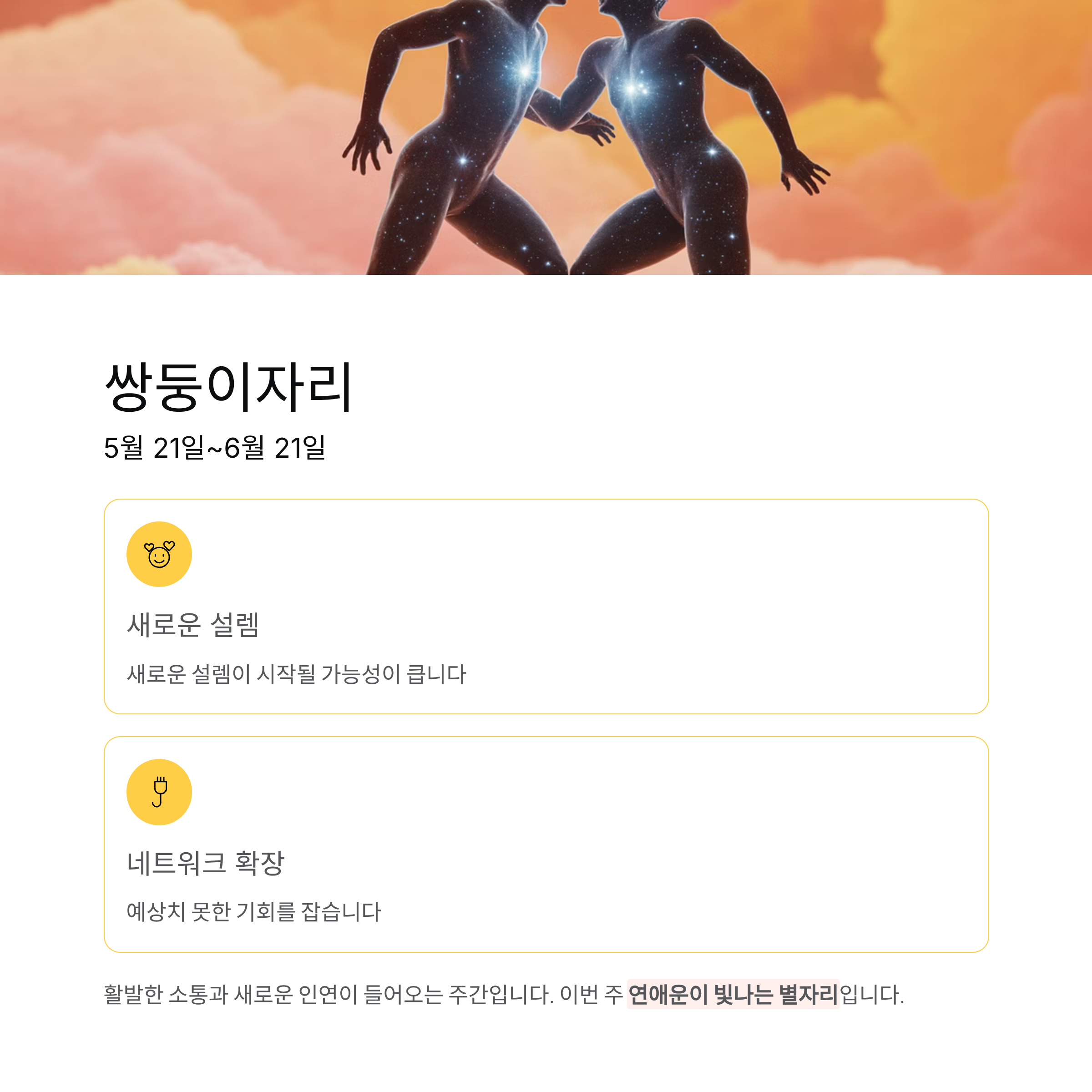 연애운은 새로운 설렘이 시작될 가능성이 큽니다.