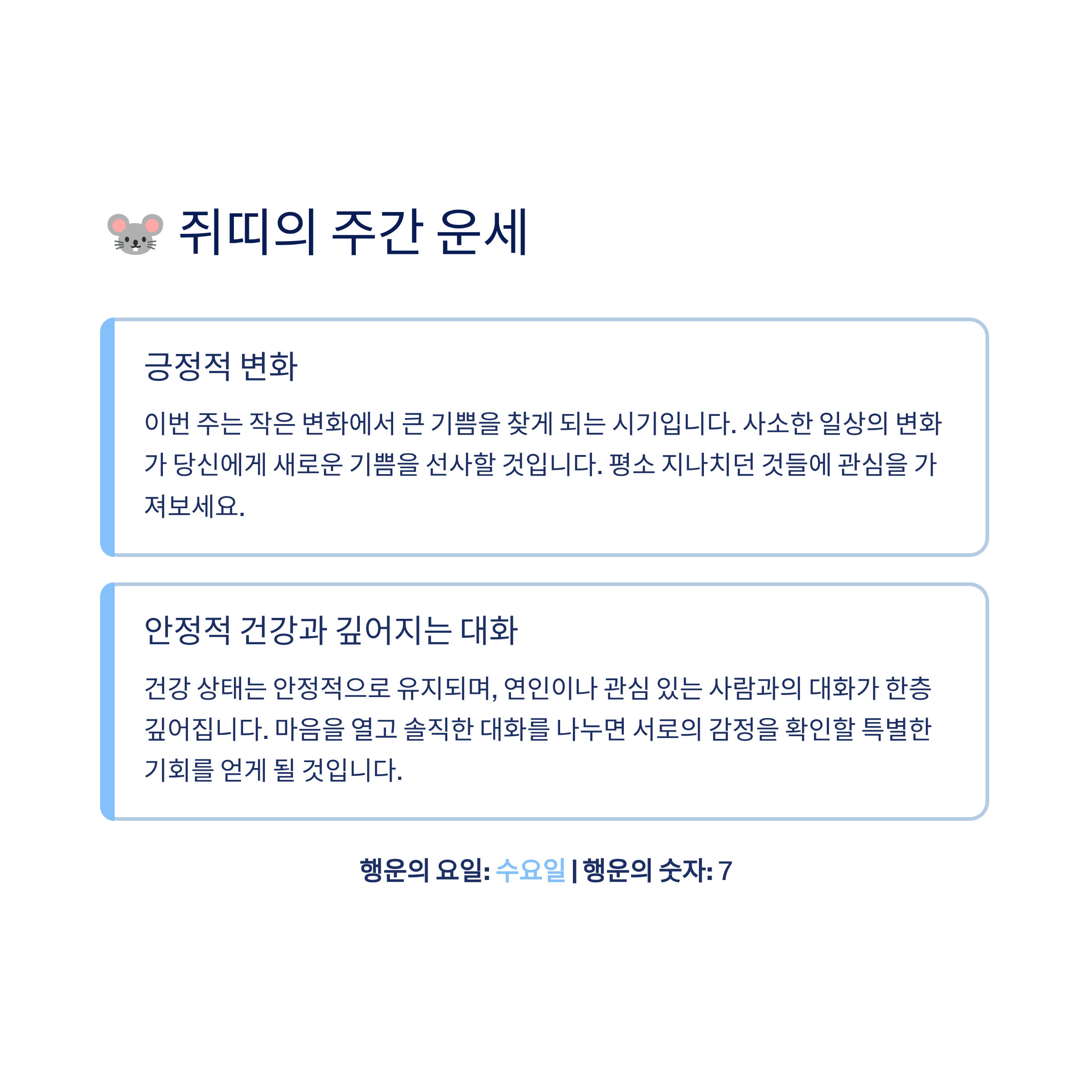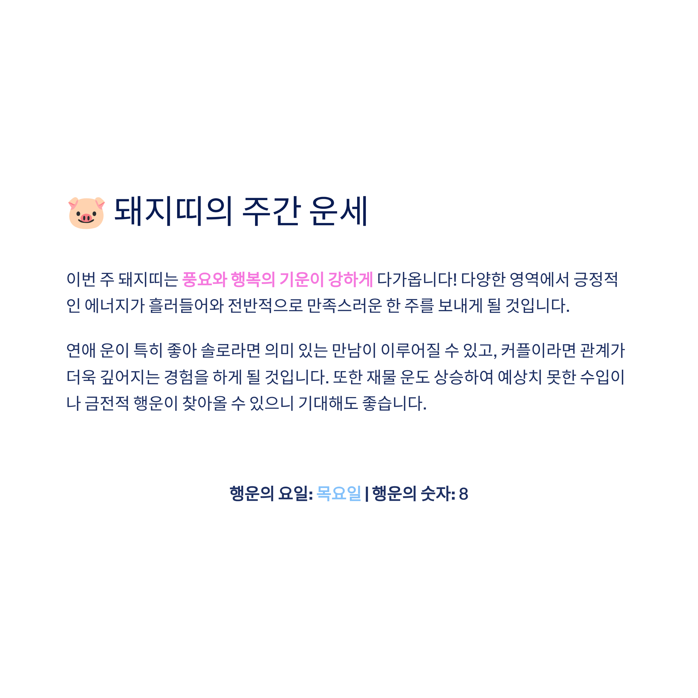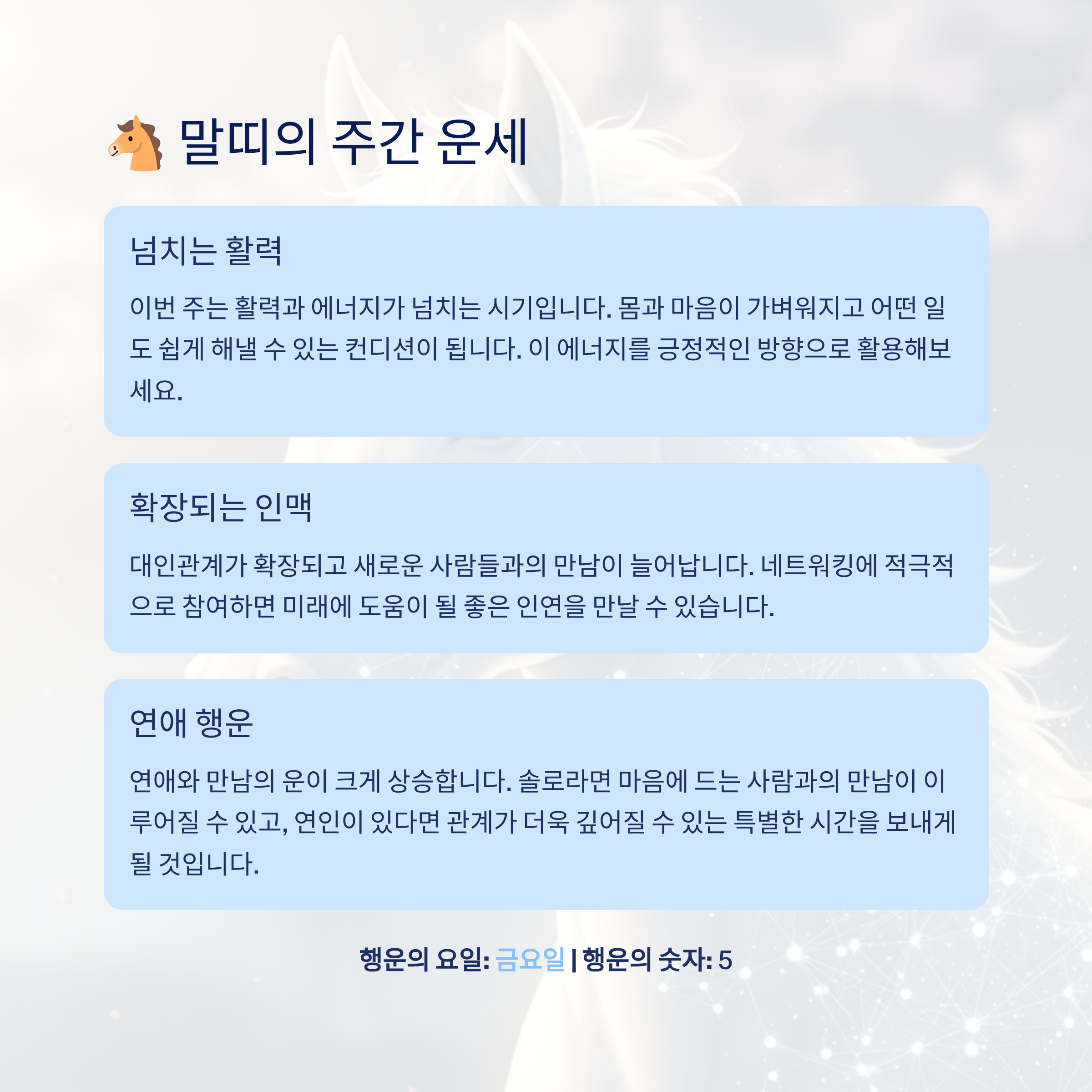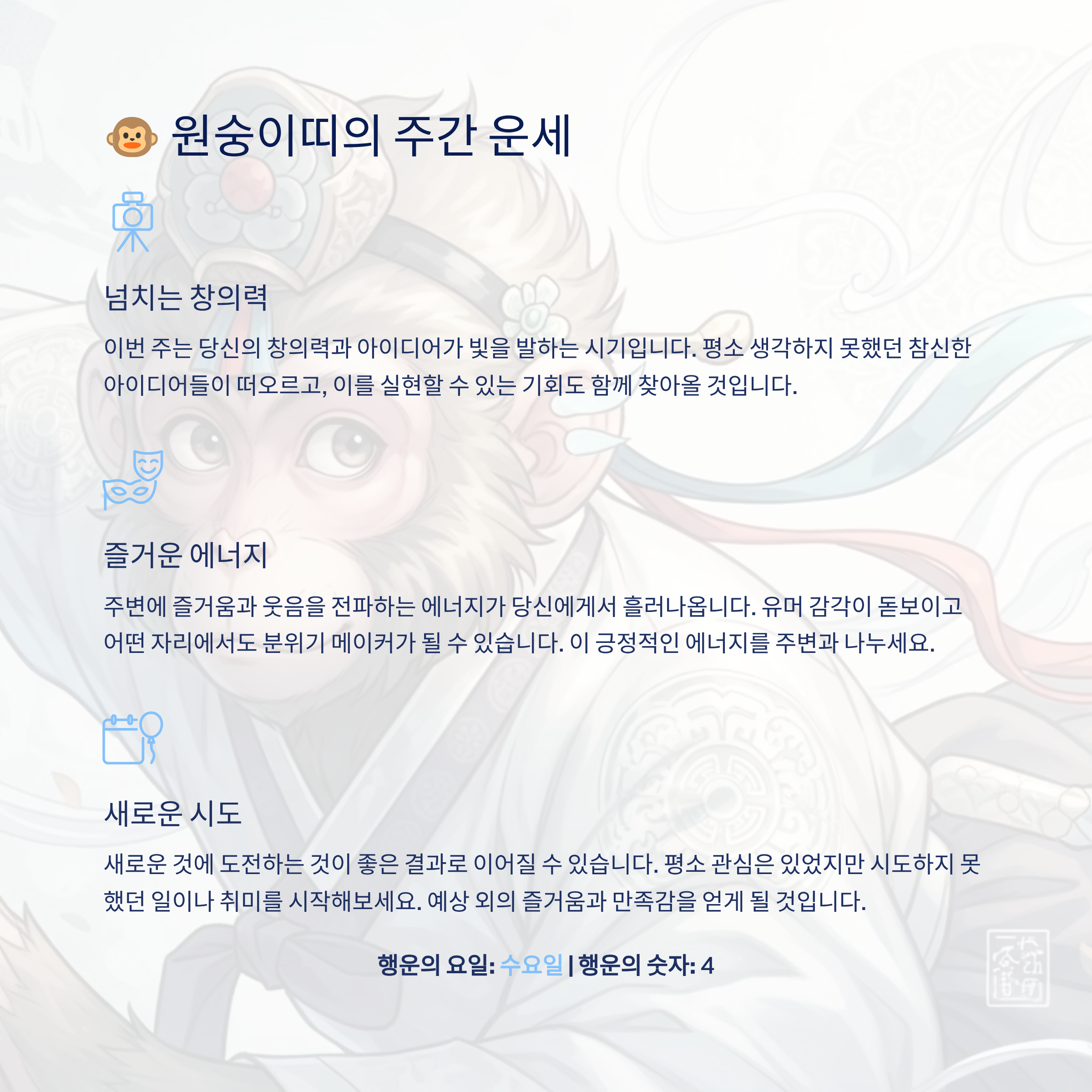행운과 건강, 연애 기운이 전반적으로 상승하며 새로운 가능성이 열리게 됩니다.