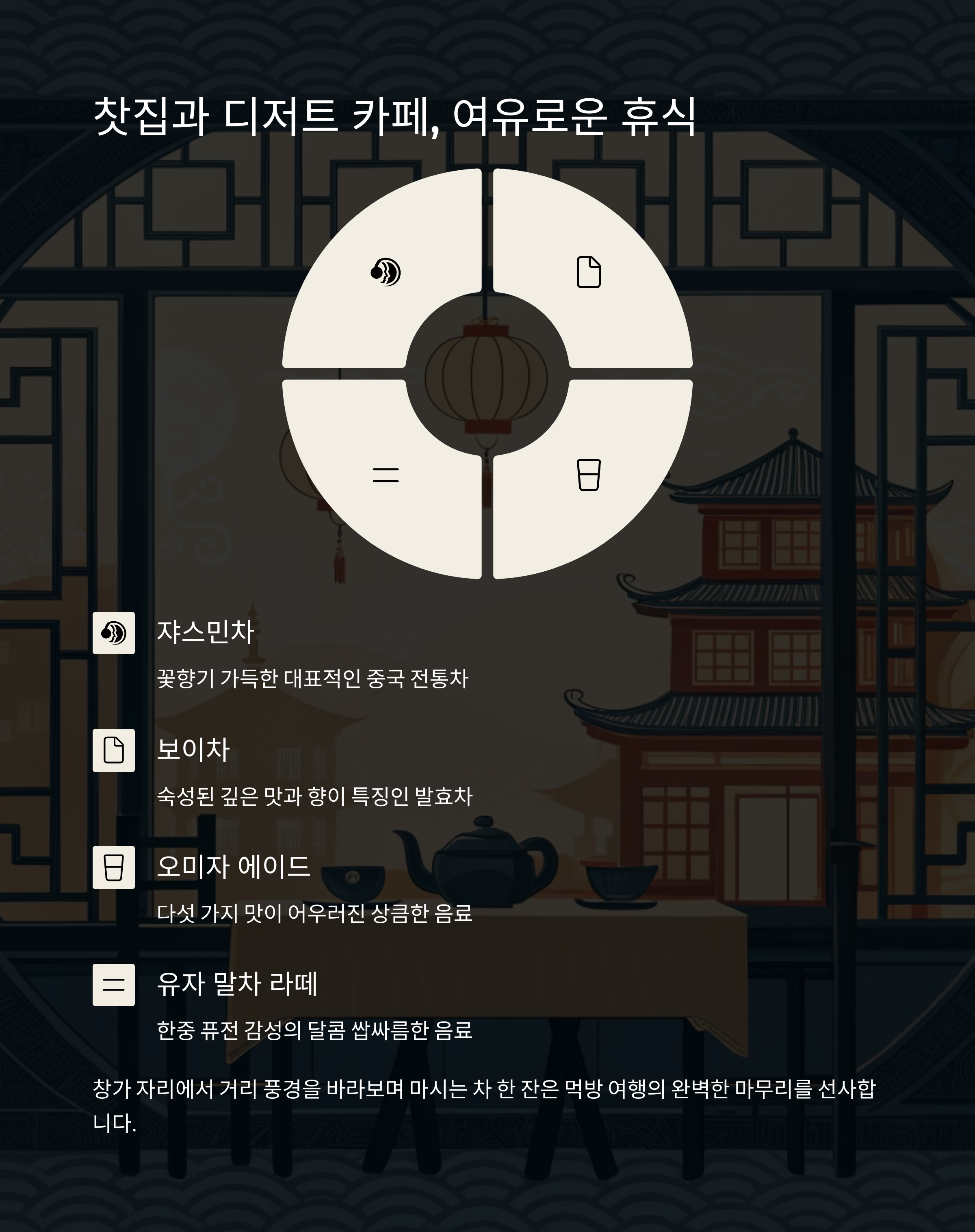 식사 후에는 중국 전통 찻집이나 감각적인 디저트 카페에서 여유로운 시간을 보내보세요.