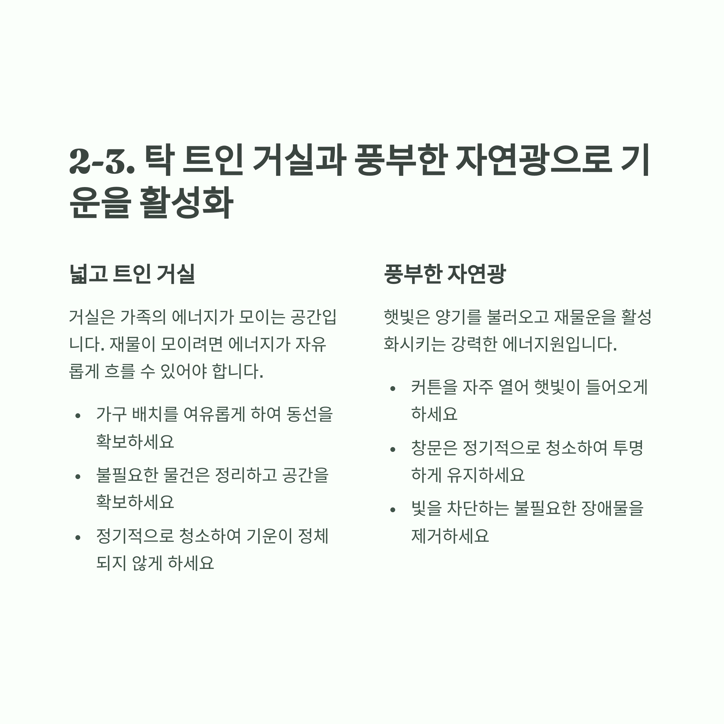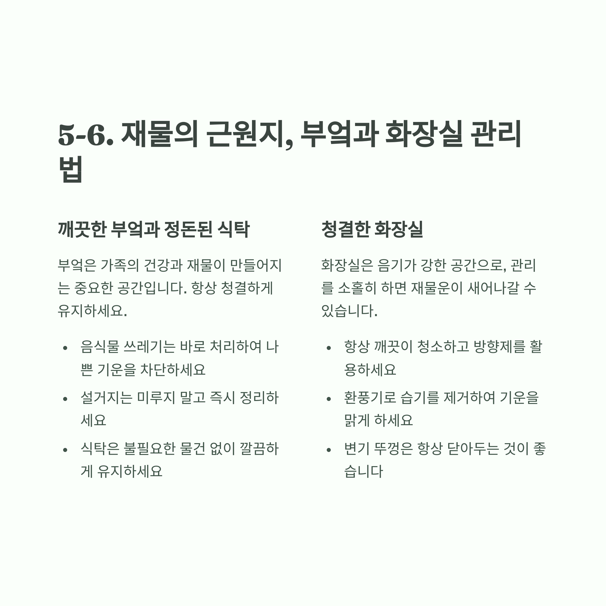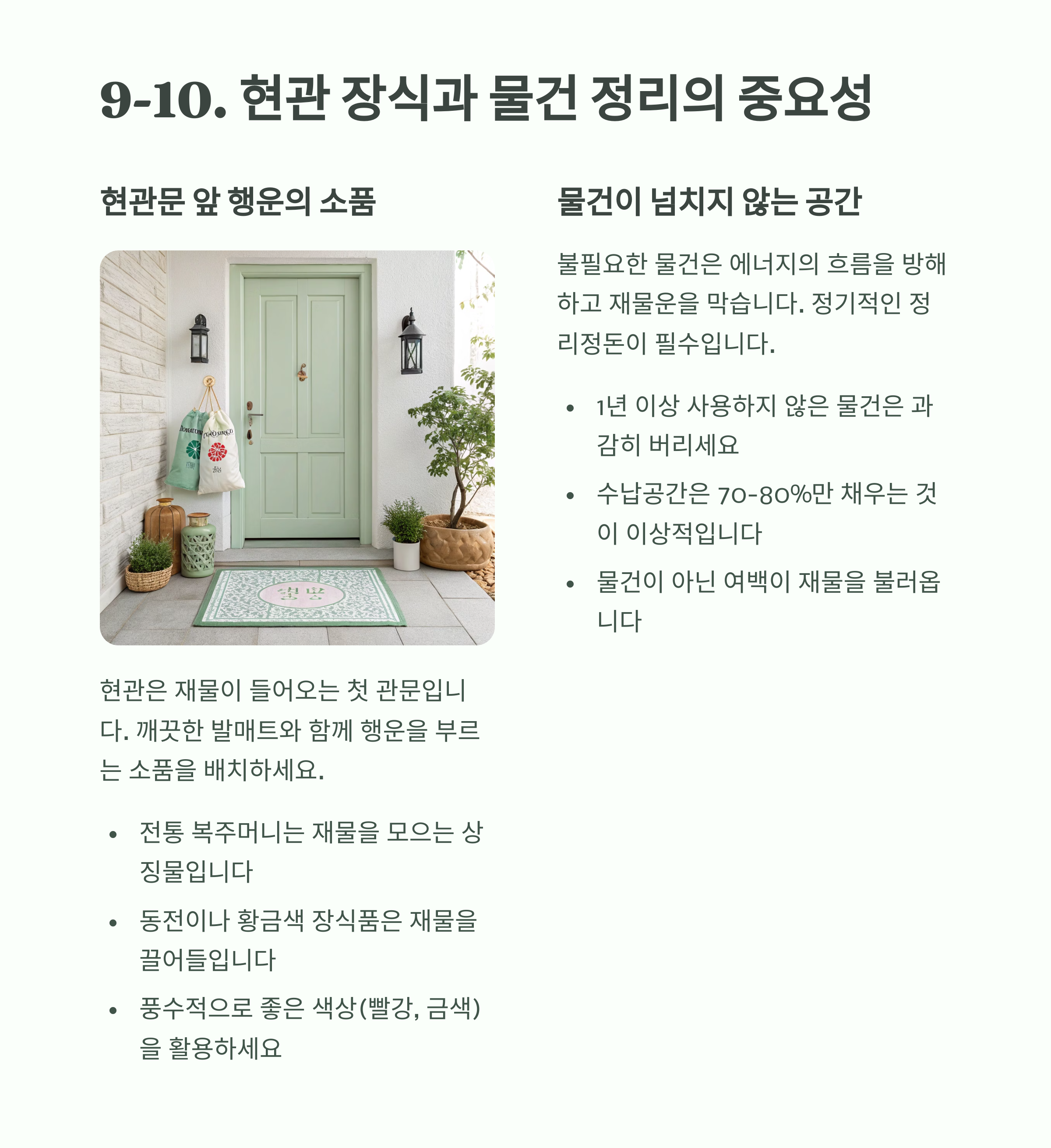 - 정돈된 공간이 좋은 기운과 재물운을 불러옵니다.