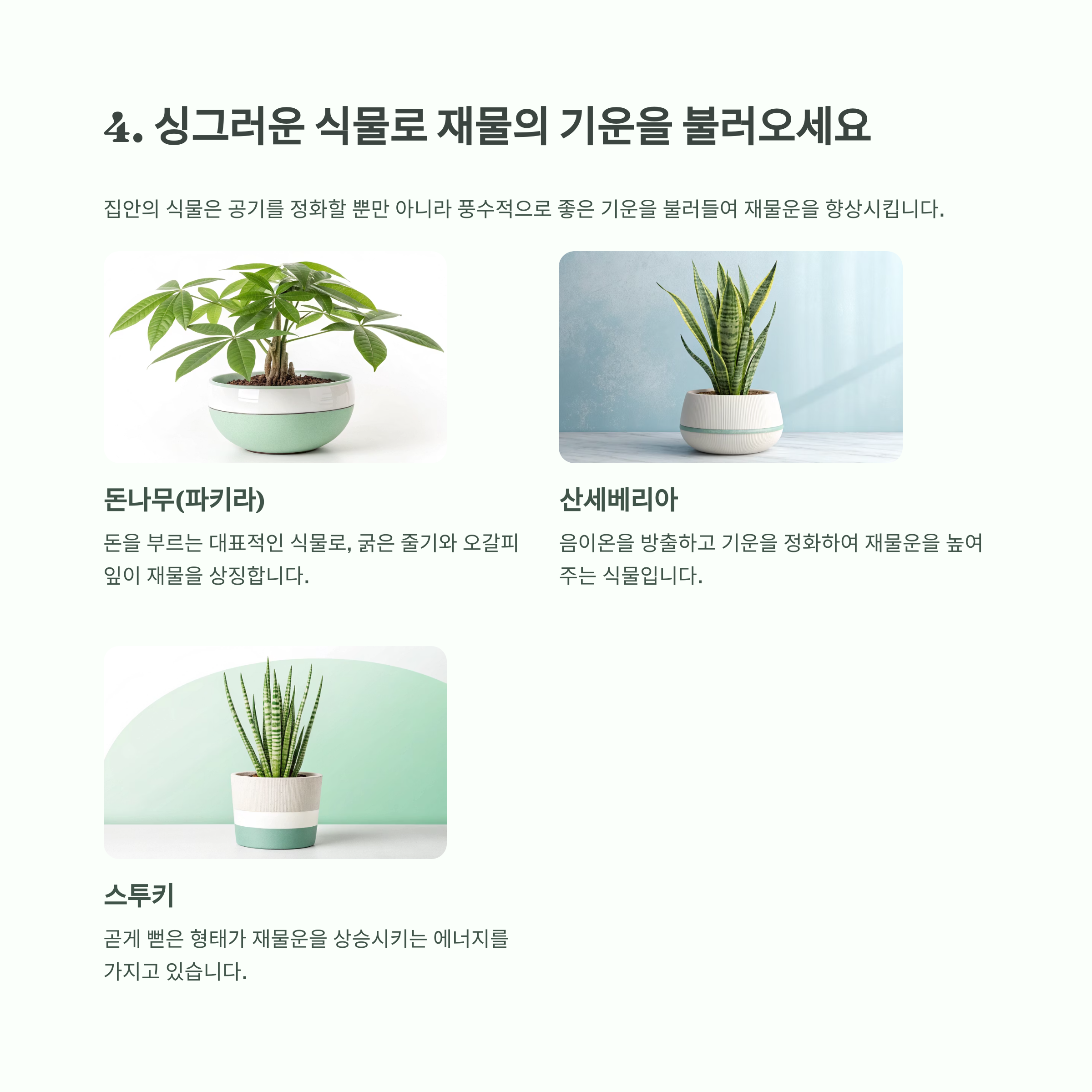 - 특히 돈나무, 산세베리아, 스투키 등이 재물운에 좋다고 알려져 있습니다.