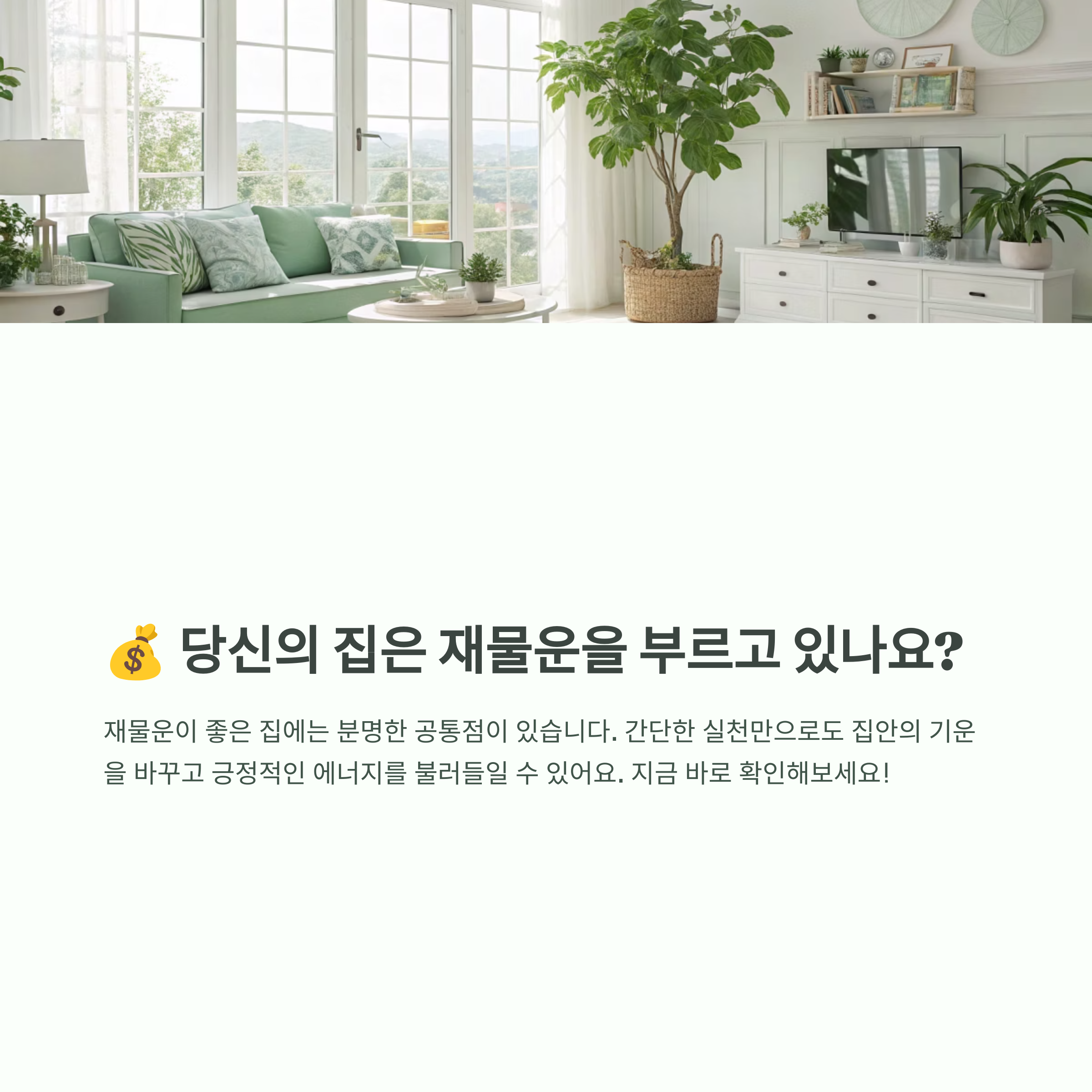 재물운을 부르는 집에는 분명한 공통점이 있습니다. 집안의 기운을 바꾸고, 긍정적인 에너지를 불러들이는 실천법을 소개합니다. 일상에서 손쉽게 적용할 수 있는 10가지 포인트를 참고해보세요.