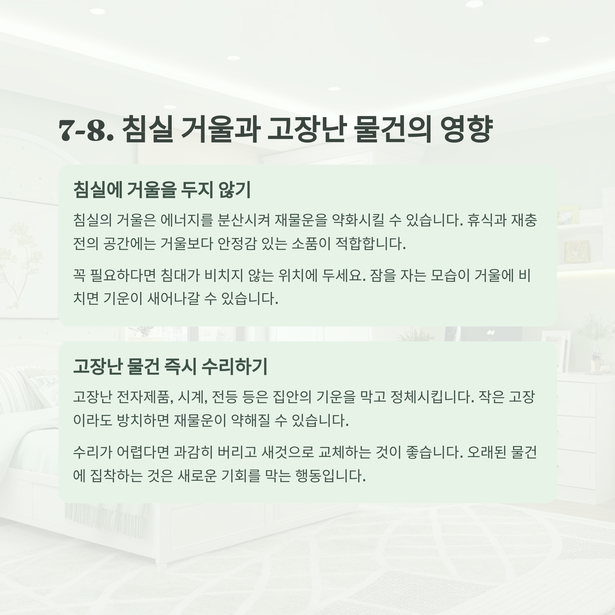 - 침실의 거울은 에너지를 분산시켜 재물운을 약화시킬 수 있습니다.