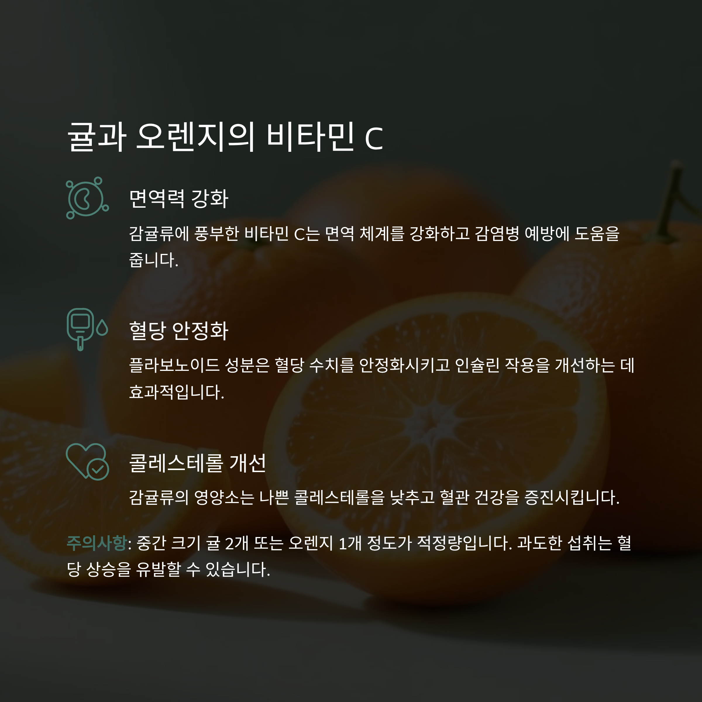 감귤류 과일은 면역력 강화와 혈당 안정에 효과적입니다.