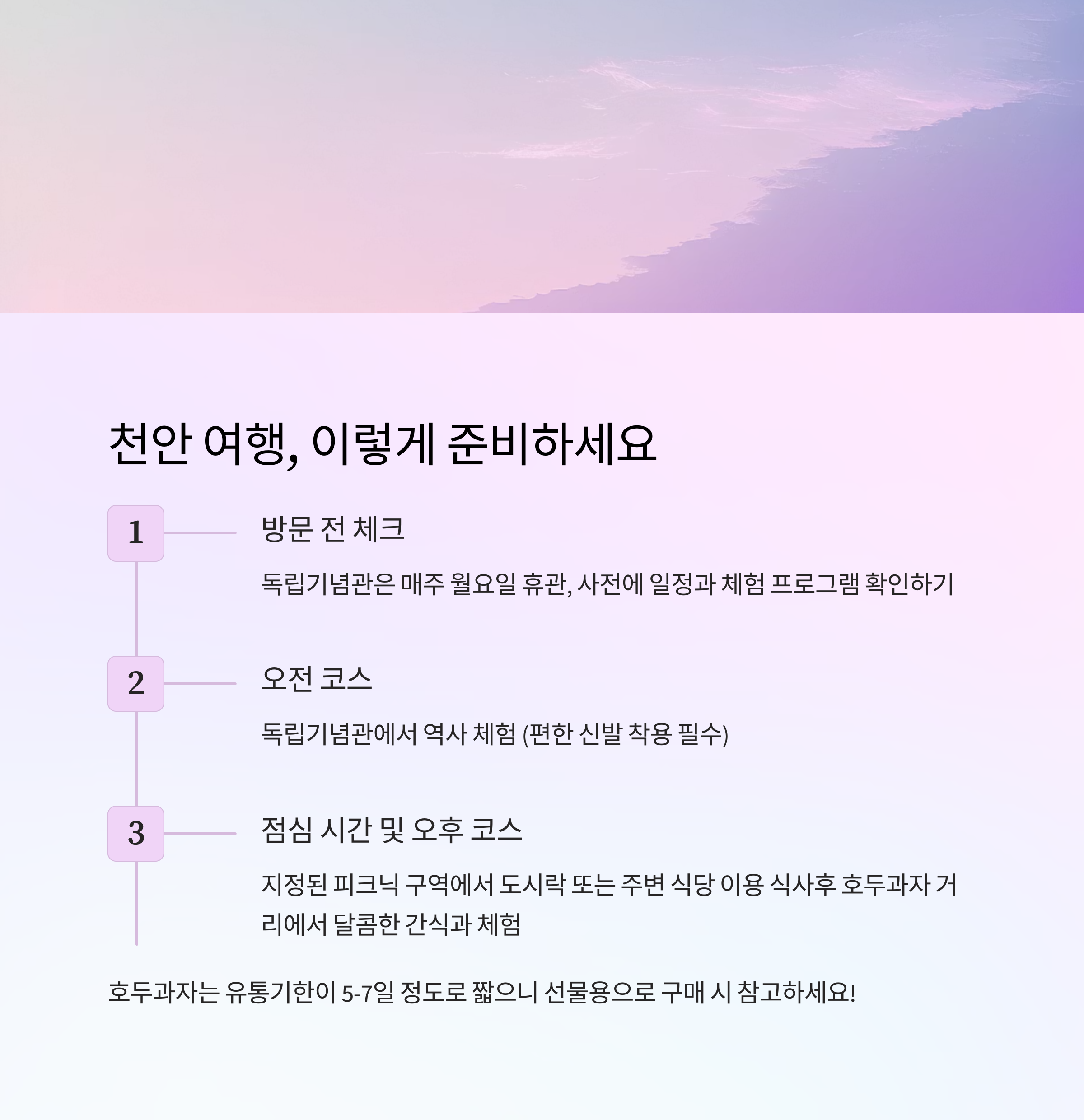 오전에 역사 체험 오후엔 달콤한 간식과 함께 여유로운 시간, 그리고 천안시내 구경까지 더하면 하루가 알차게 채워집니다.