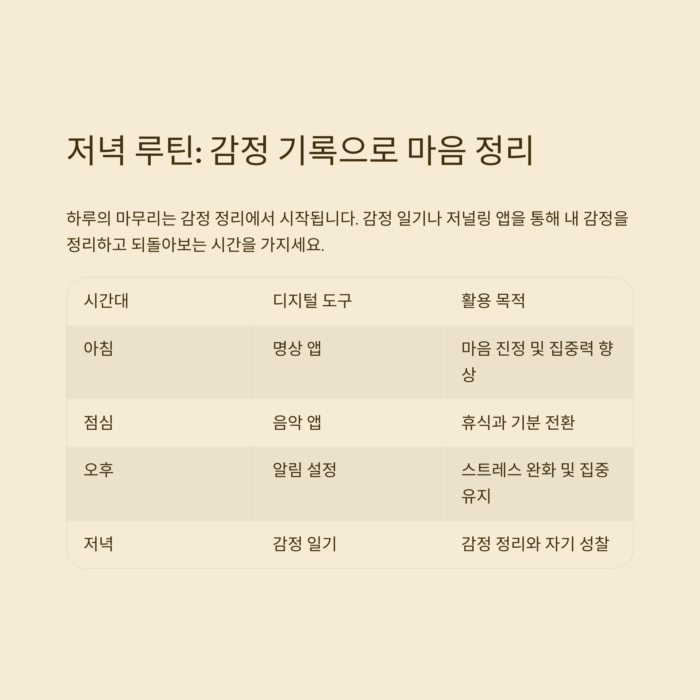 - 휴대폰 멀리하기 & 릴렉스 음악 듣기 (5분) : 뇌 휴식과 숙면 유도