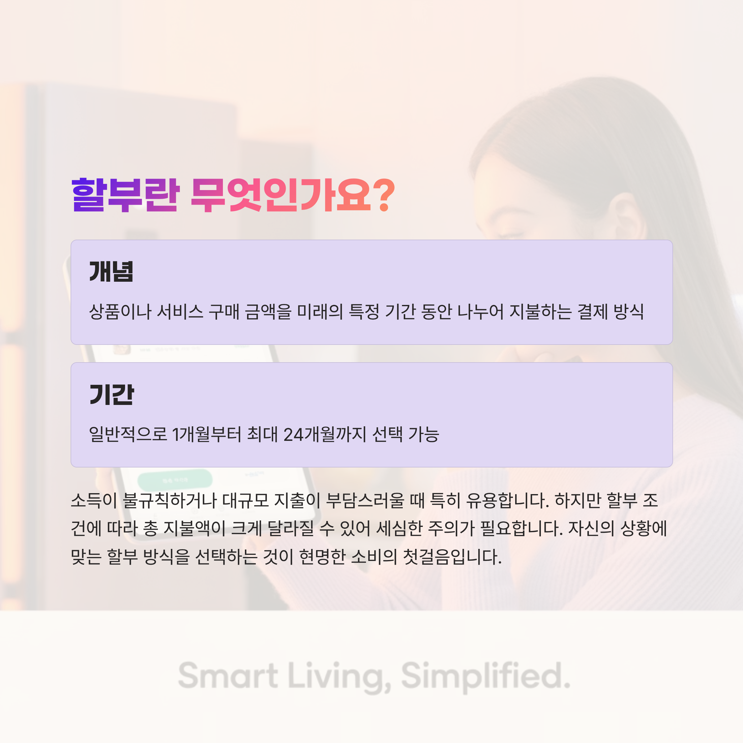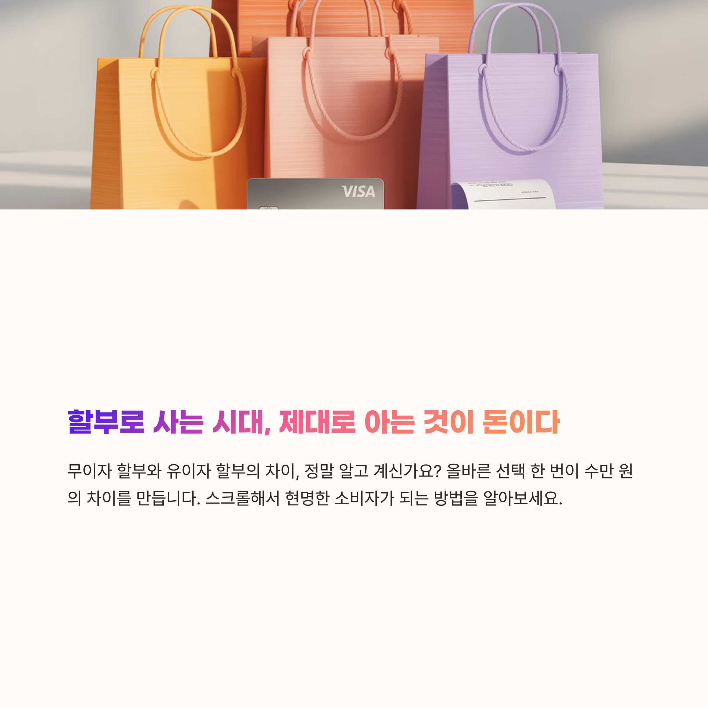 할부는 오늘날 소비생활의 일부가 되었습니다. 고가의 제품이나 서비스를 구매할 때 현금 부담을 줄여주는 유용한 수단인데요. 하지만 무이자와 유이자 할부의 차이를 정확히 이해하지 못하면 오히려 손해를 볼 수도 있습니다. 이번 글에서는 할부의 기본 개념부터 무이자·유이자 차이, 주의사항등을 알아봅니다.