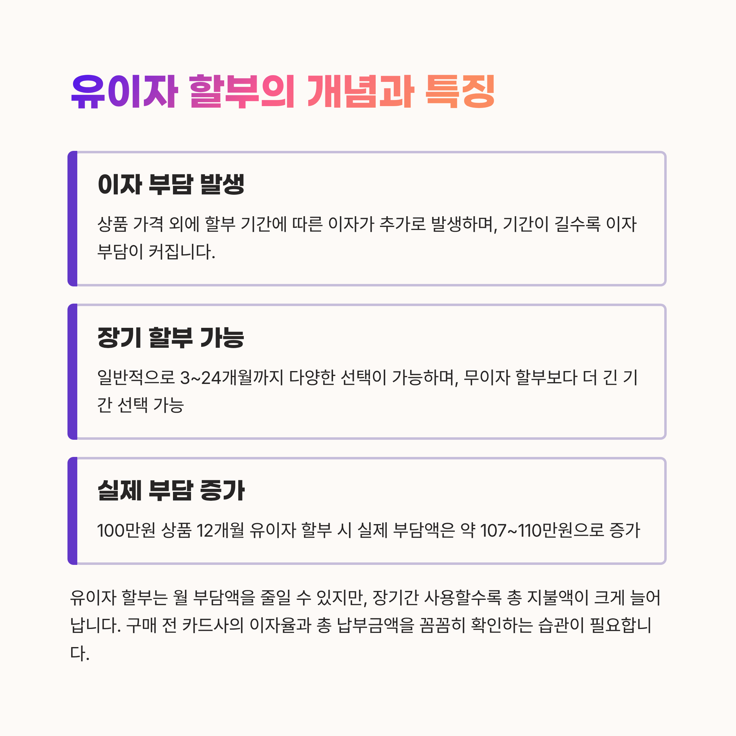 위 표를 보면 유이자 할부의 경우 기간이 길어질수록 추가 이자 부담이 눈에 띄게 증가합니다.