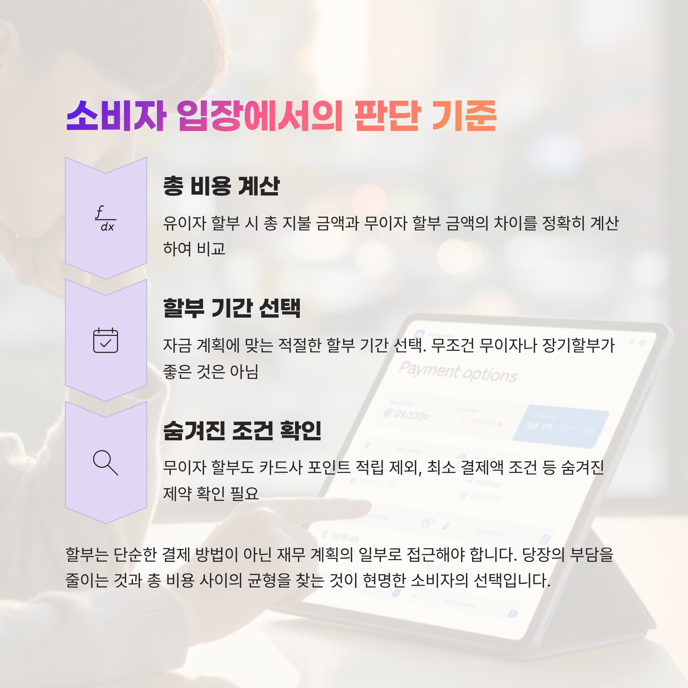 무이자 할부는 소비자에게 유리한 조건이지만, 무조건 좋은 것만은 아닙니다.