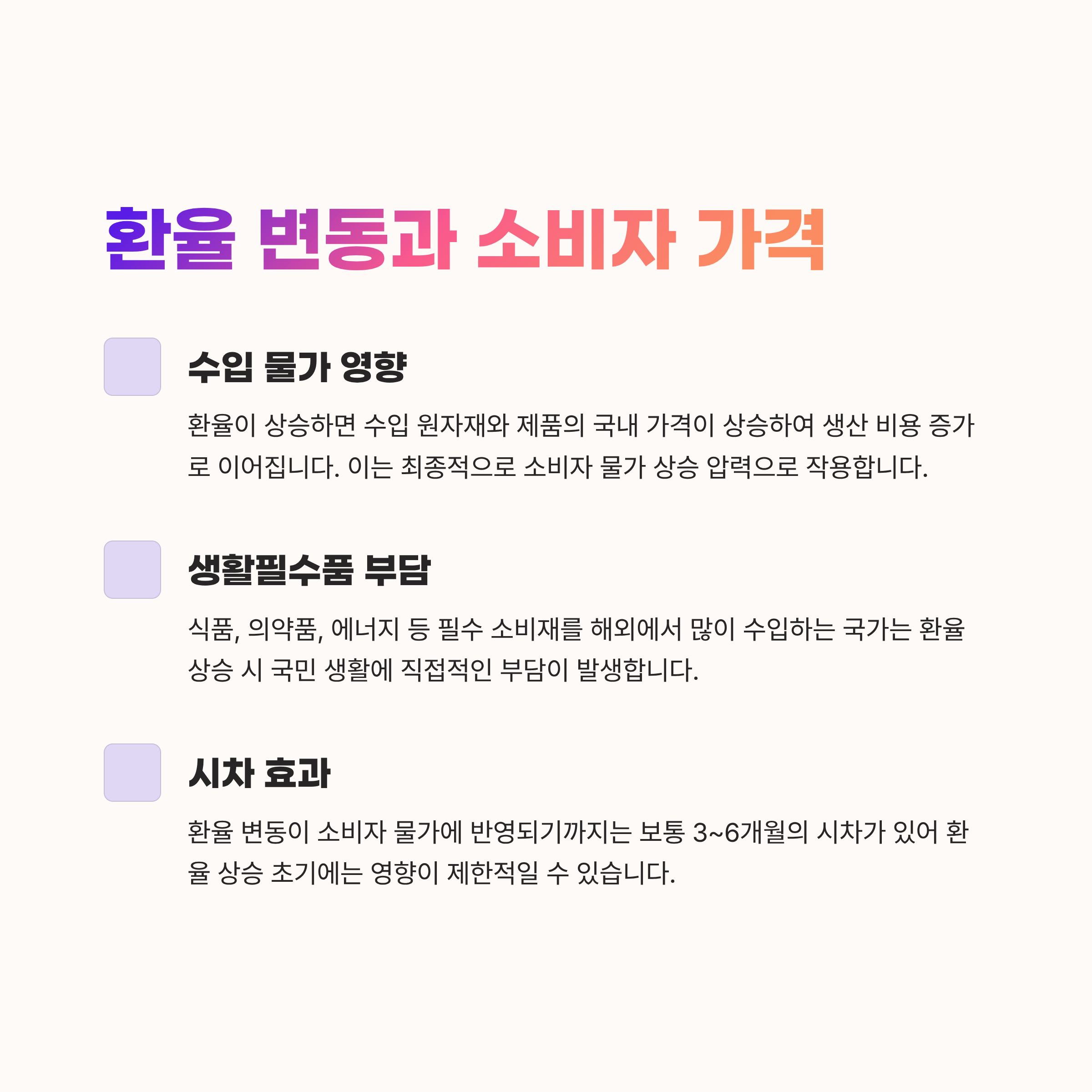 특히 생활필수품을 많이 수입하는 국가에서는 환율 변동이 곧바로 소비자 물가에 반영되며
