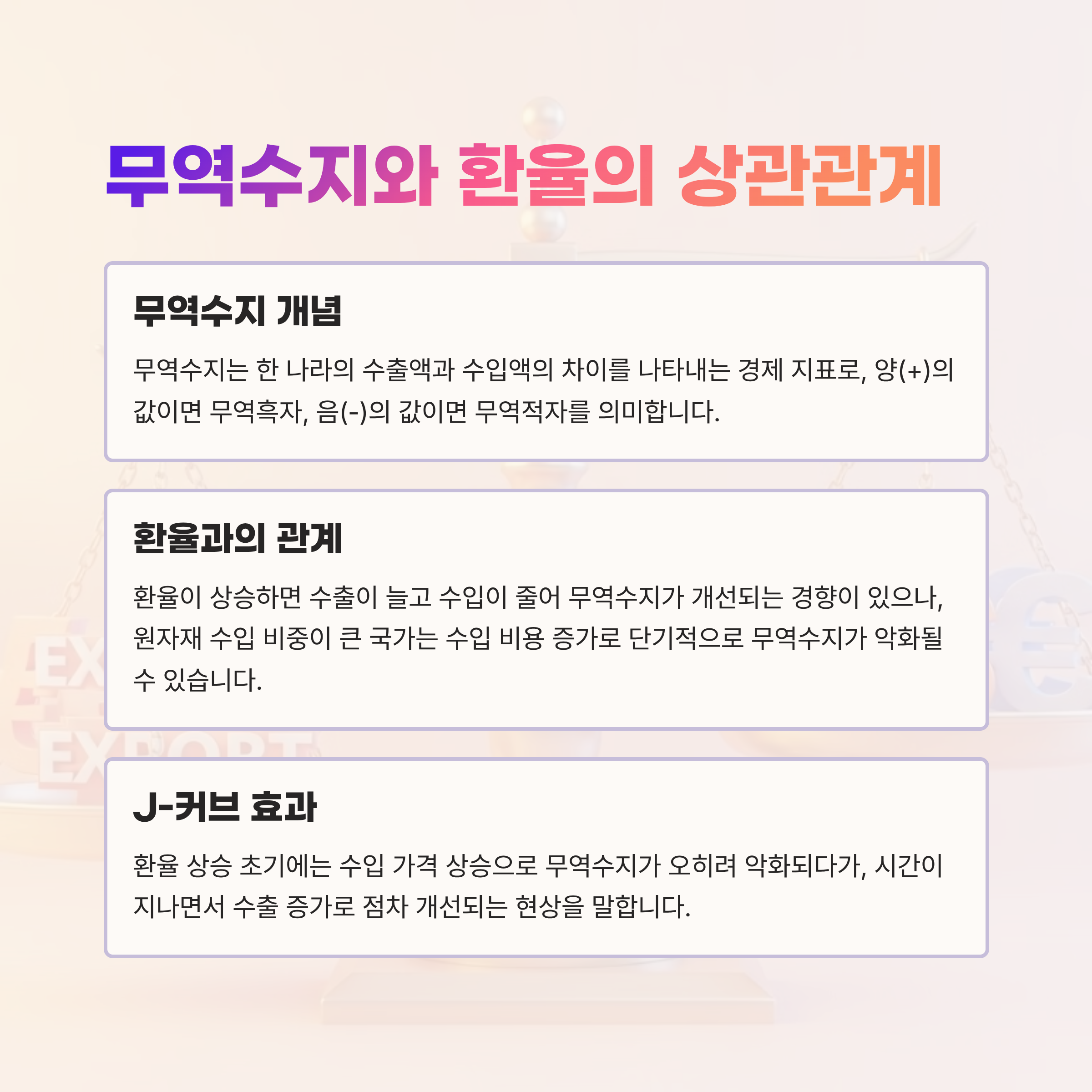 무역수지는 한 나라의 수출과 수입의 차이를 의미합니다. 환율이 변하면 수출입 가격과