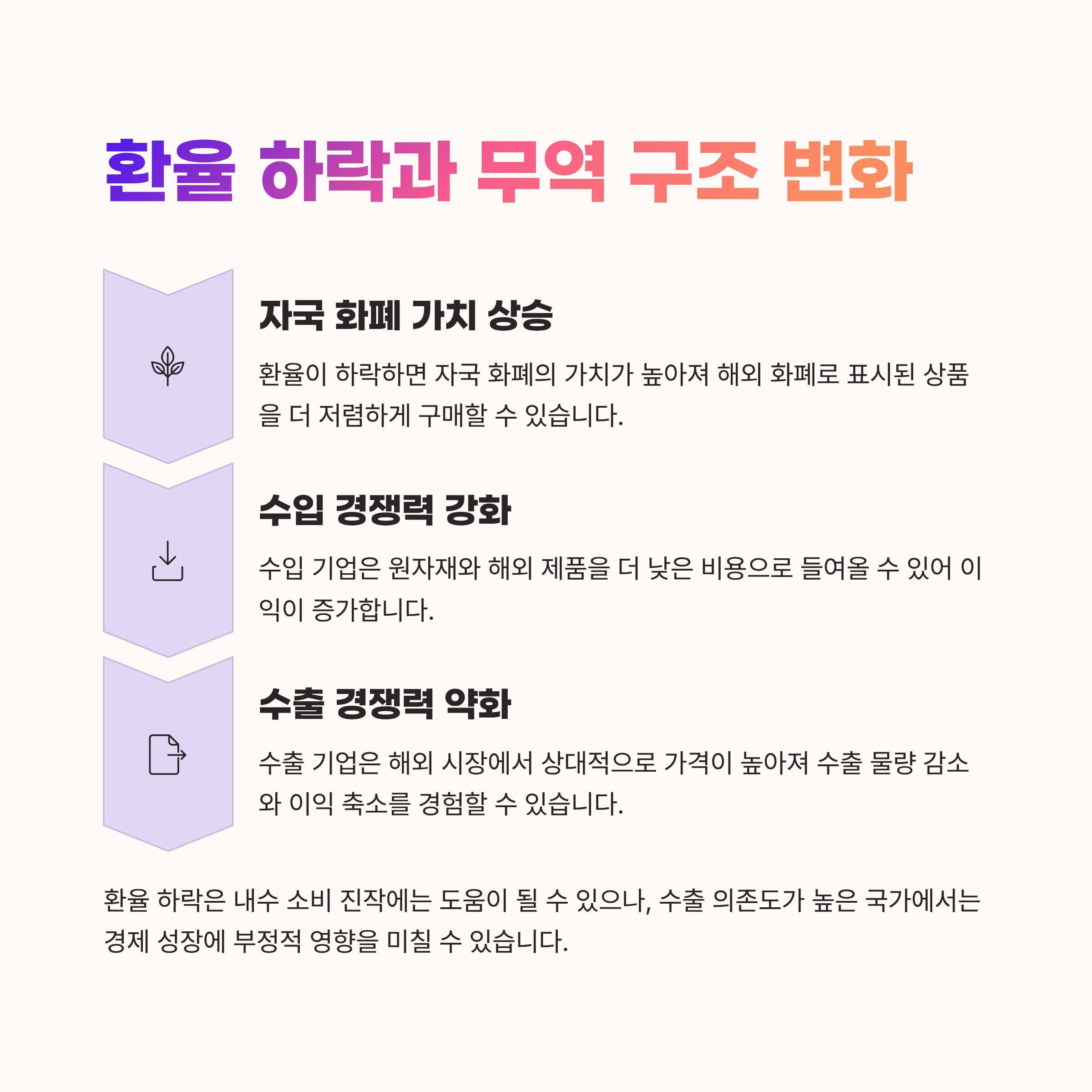 | 환율 상승 | 가격 경쟁력 강화, 수출 증가 | 원자재·제품 수입 비용 상승 | 물가 상승 압력 |