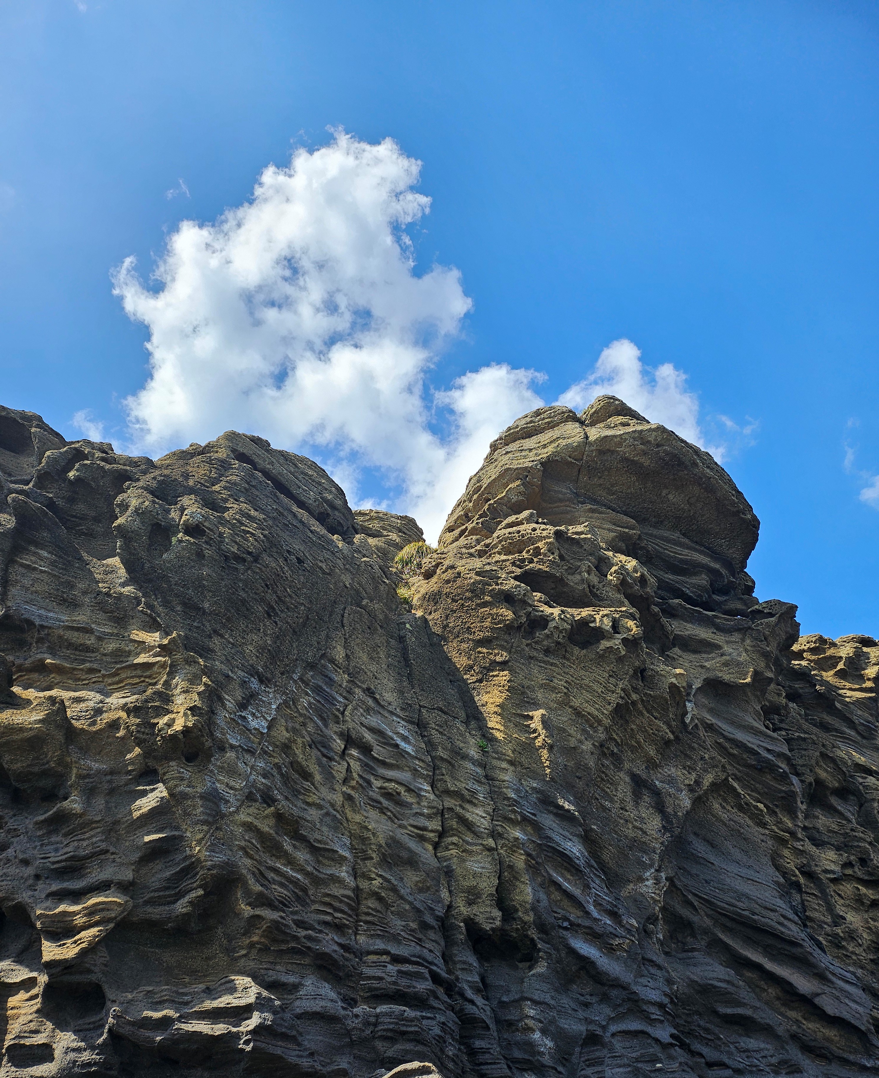 절벽과 바다가 만나는 드라마틱한 풍경! 바람 맞으며 걷는 맛이 있었어요. 용머리해안은 산방산 자락에서 해안가로 뻗 어나가는 곳에 위치하여, 마치 바다 속으로 들어가는 용의 머리를 닮았다 하여 이름 붙여졌답니다. 수천만년 동안 층 층이 쌓인 사암층 암벽이 파도에 깎여 기묘한 절벽을 이루고 있습니다. 길이 30~50m의 절벽이 굽이치듯 이어지는 장 관은 CF와 영화의 배경으로도 촬영된 바 있습니다.