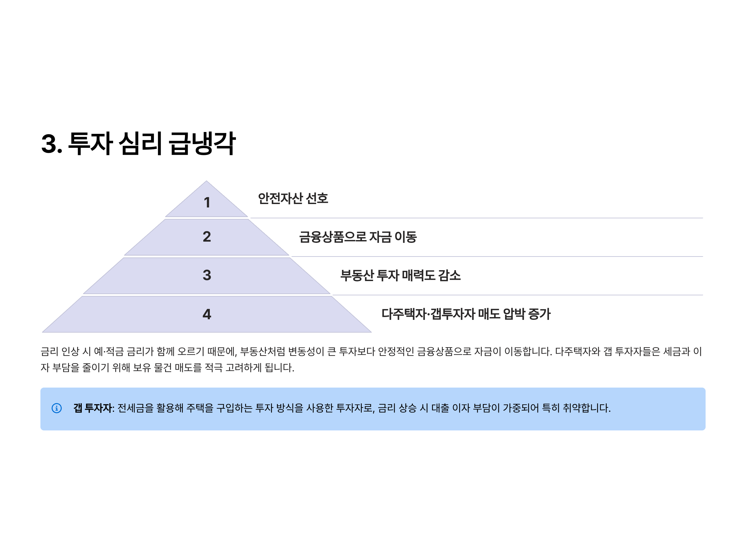금리 인상 시 예·적금 금리가 함께 오르기 때문에, 부동산처럼 변동성이 큰 투자보다 안정적인 금융상품으로 자금이 이동합니다. 다주택자·갭 투자자 등은 세금과 이자 부담을 줄이기 위해 매도를 고려하게 됩니다.