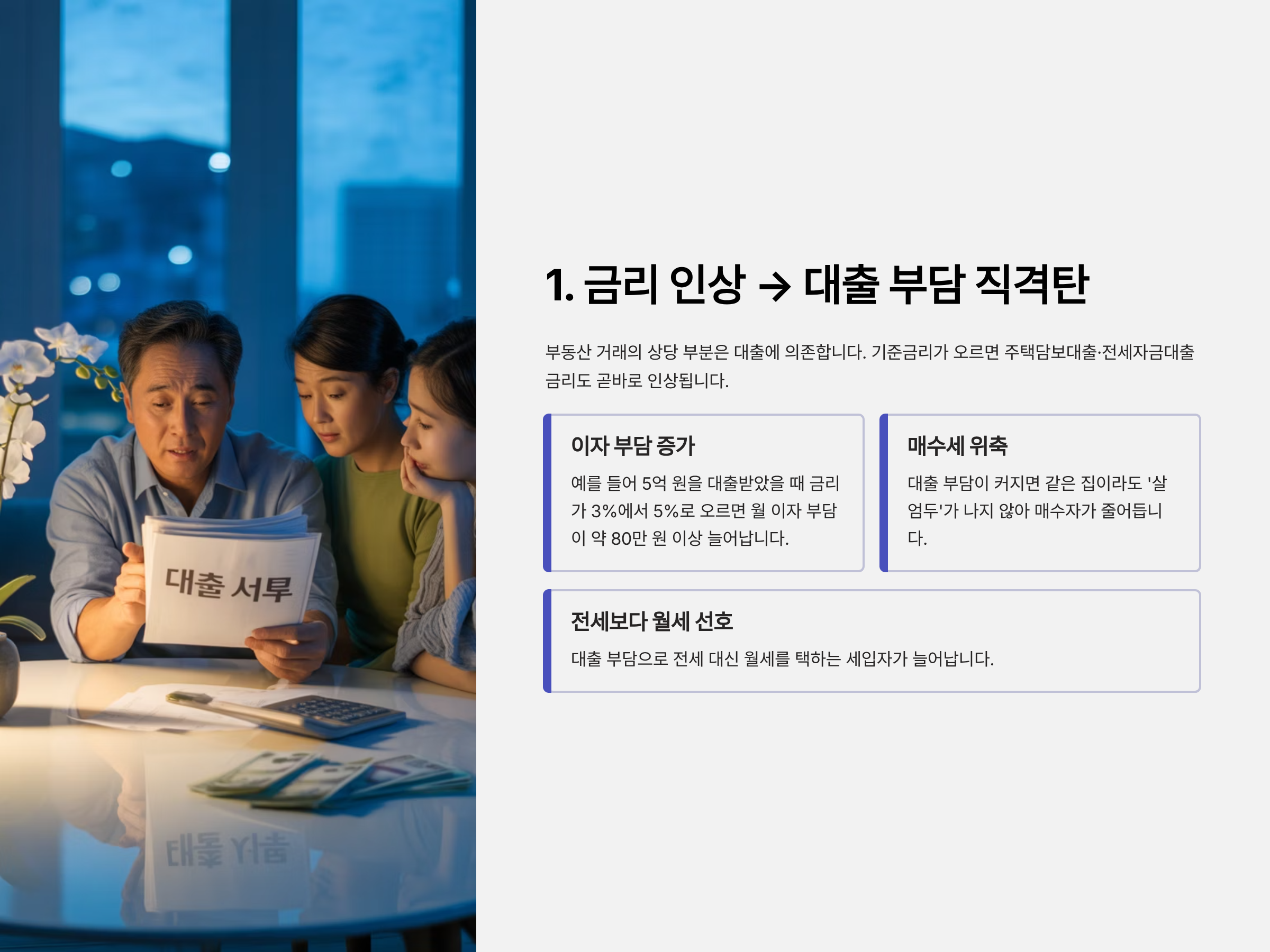 - 핵심: 금리 자체보다 대출 구조 변화와 투자 심리 위축이 시장을 움직인다.
