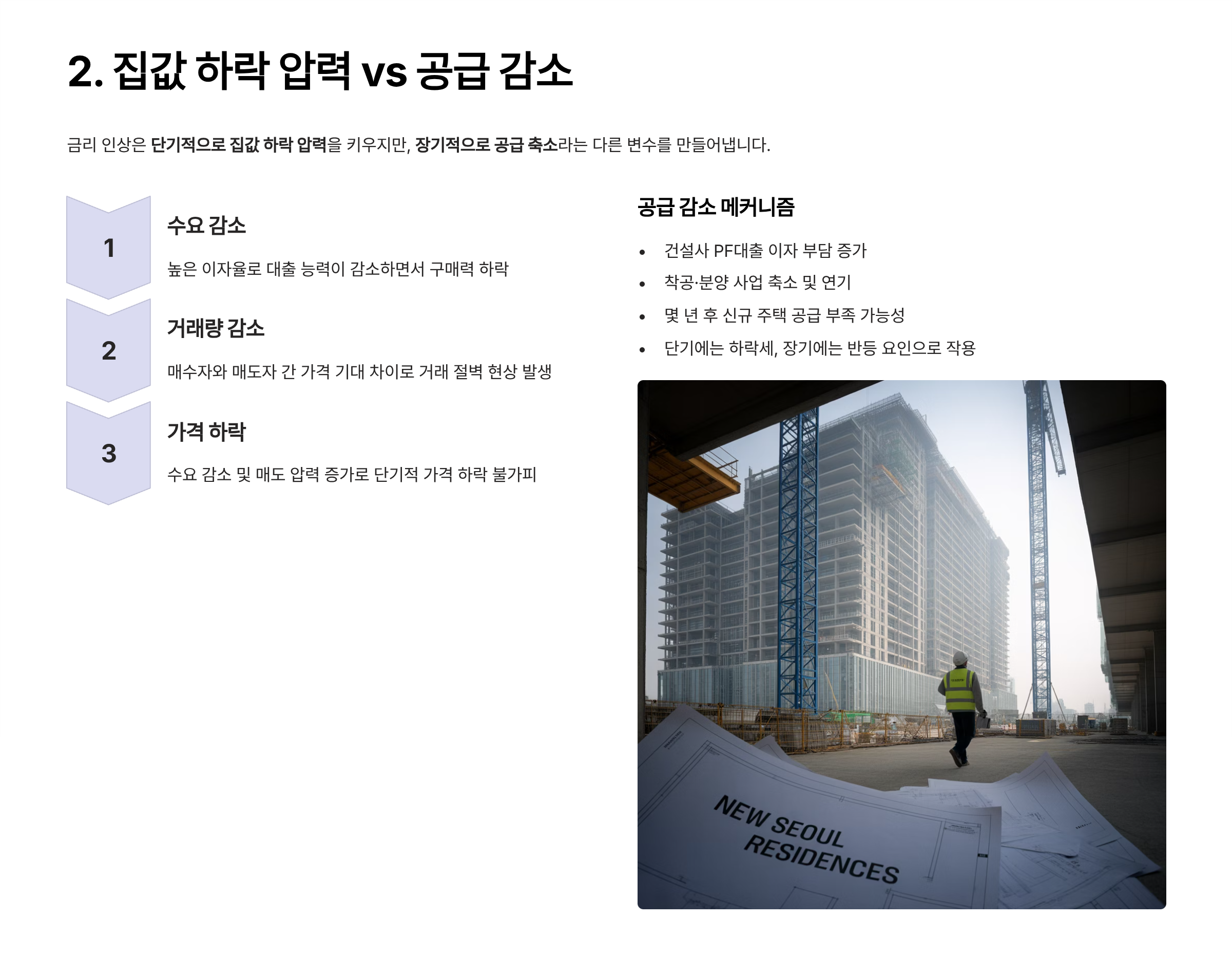 금리 인상은 단기적으로 집값 하락 압력을 키우지만, 장기적으로 공급 축소라는 다른 변수를 만들어냅니다.