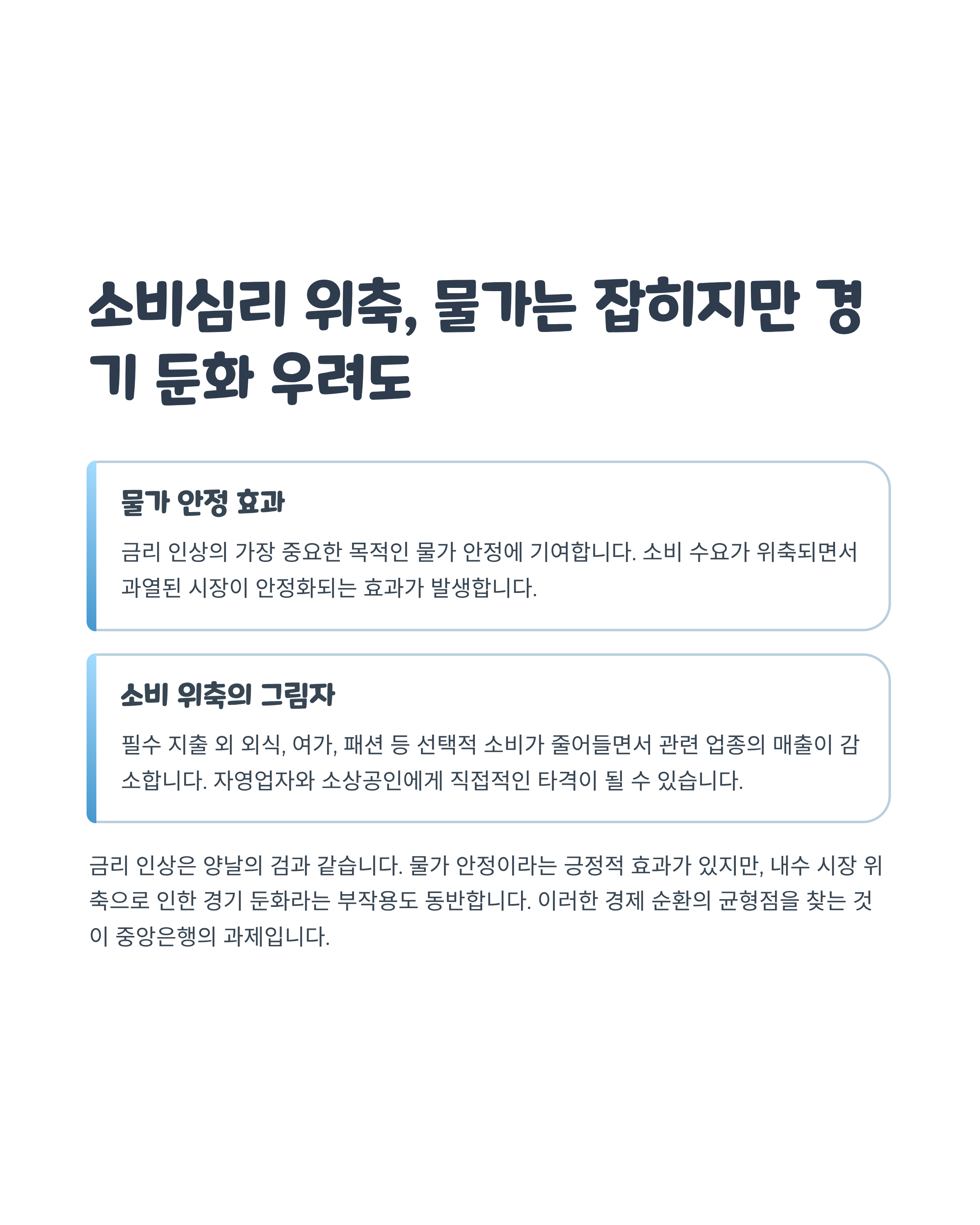 - 이자 부담으로 소비 줄어듦 → 수요 억제 → 물가 안정 효과