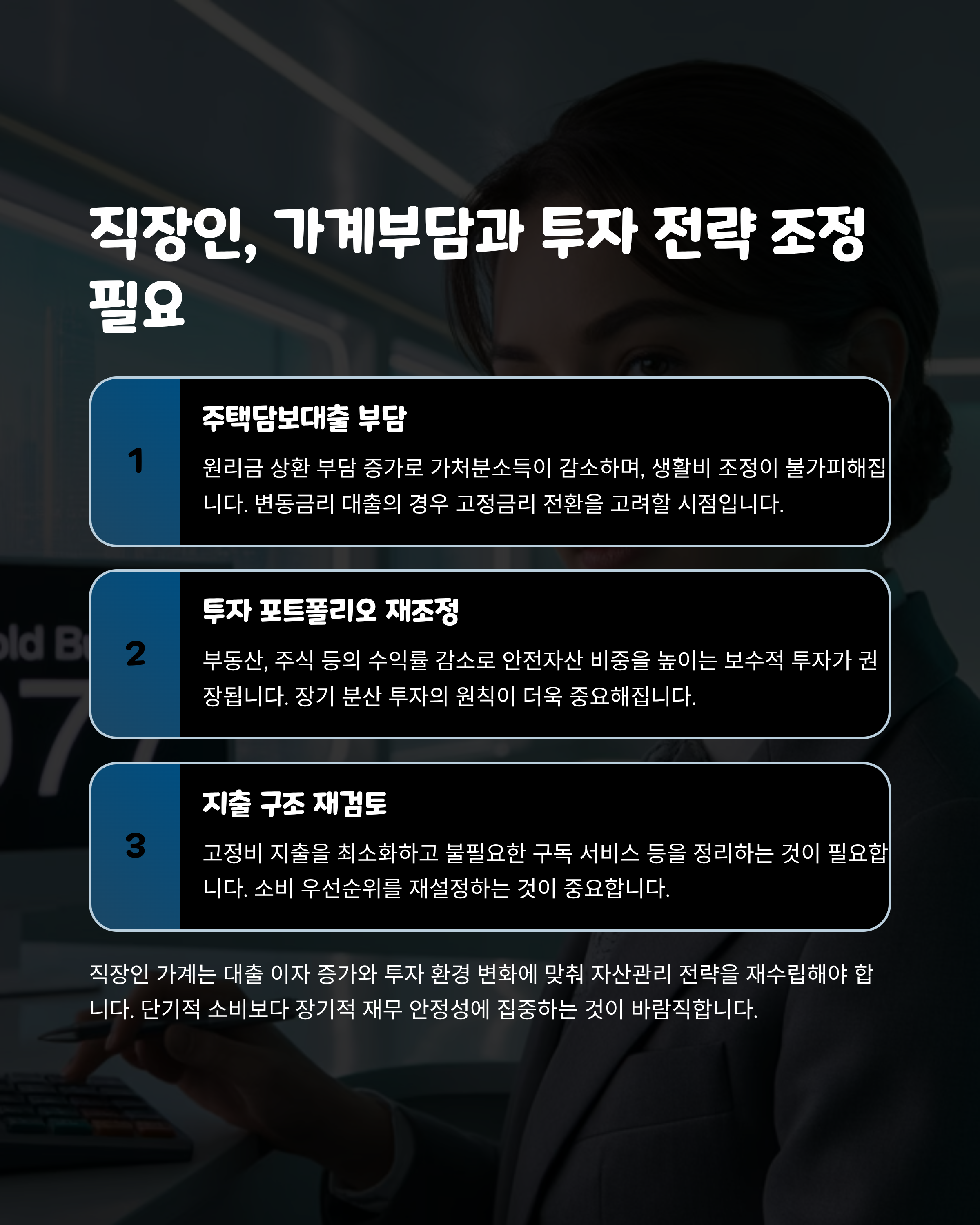 다만, 가계에 빚이 많거나 투자에 적극적인 사람에게는 단기적으로 부담이 커지는 시기입니다.