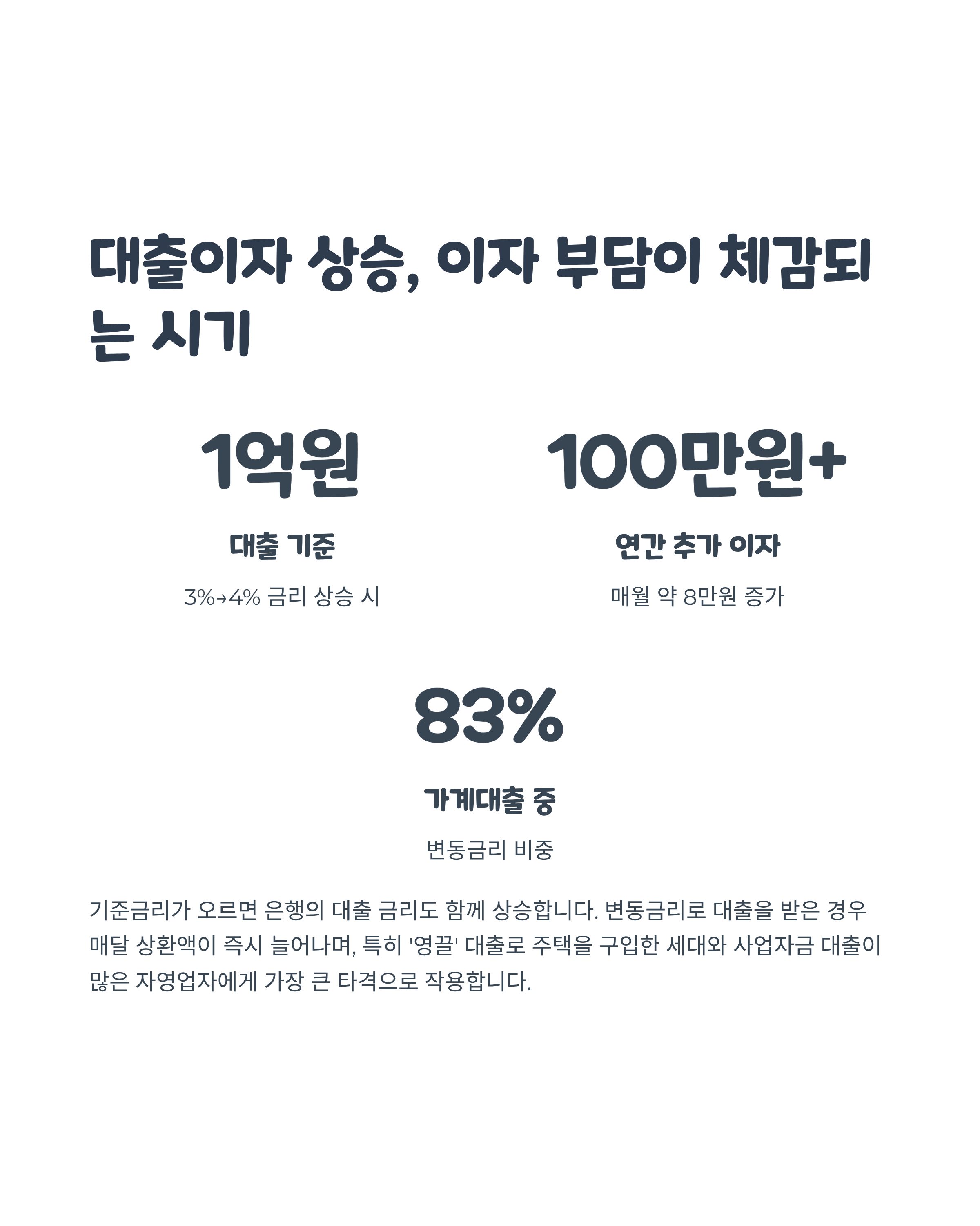 - 예를 들어, 1억 원 대출 시 금리가 3% → 4%로 오르면, 연 100만 원 추가 부담