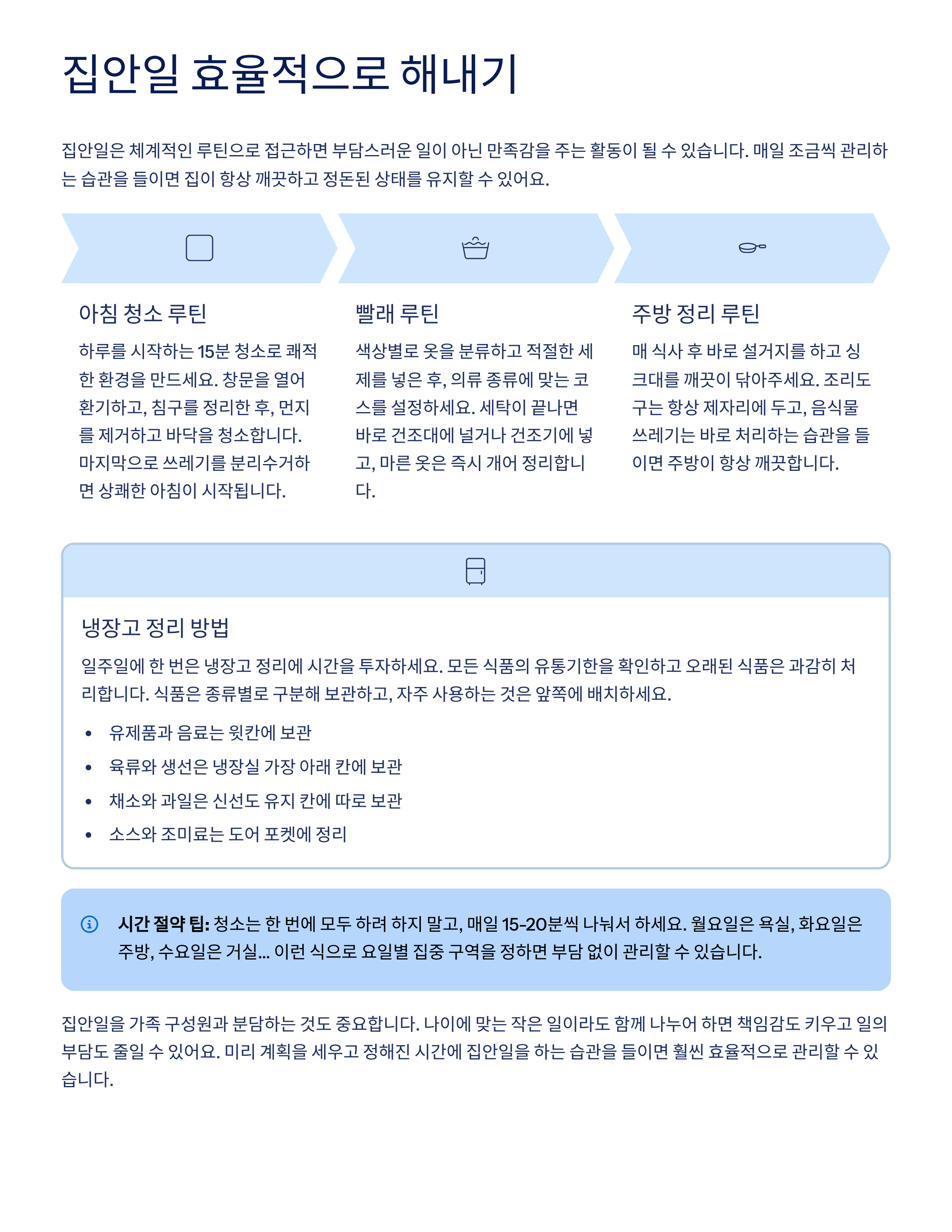 1. 아침 청소 루틴 → 창문 열기 → 침구 정리 → 먼지 제거 → 바닥 청소 → 쓰레기 버리기