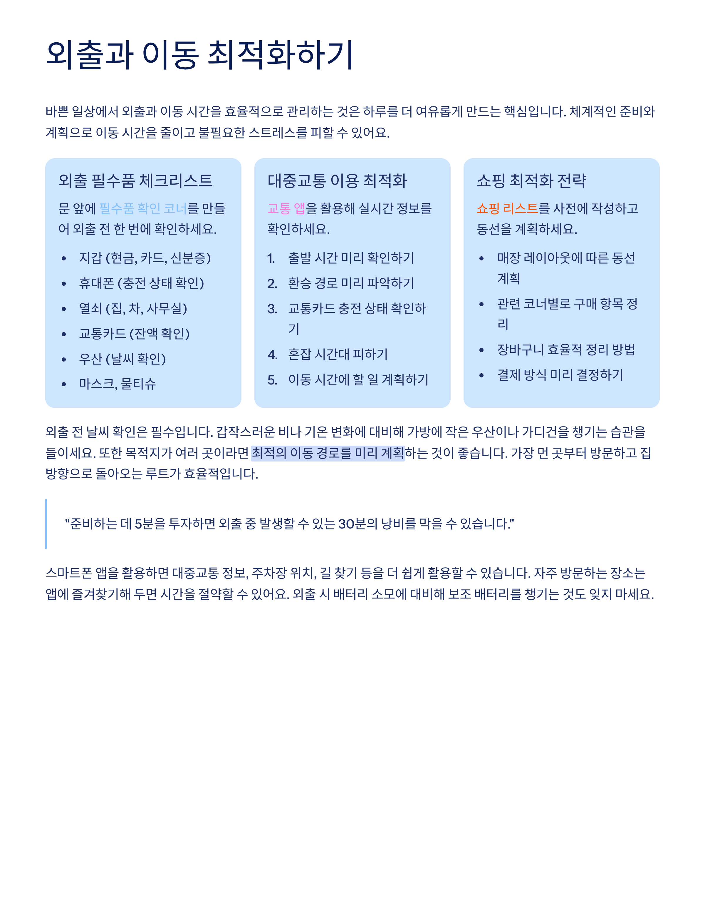 6. 대중교통 이용 → 출발 시간 확인 → 환승 경로 설정 → 교통카드 준비 → 탑승