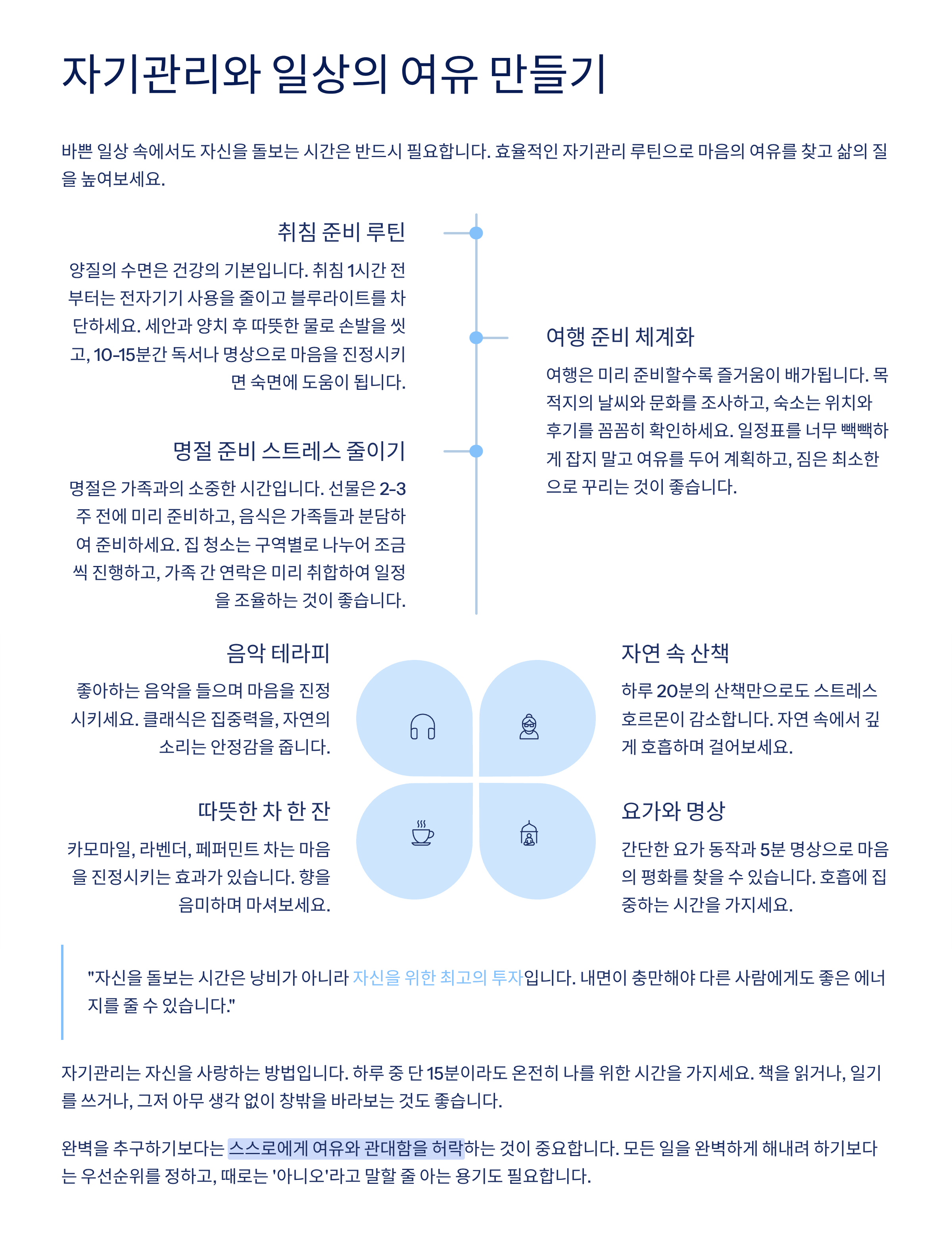20. 스트레스 해소 → 음악 듣기 → 산책 → 요가/명상 → 따뜻한 차