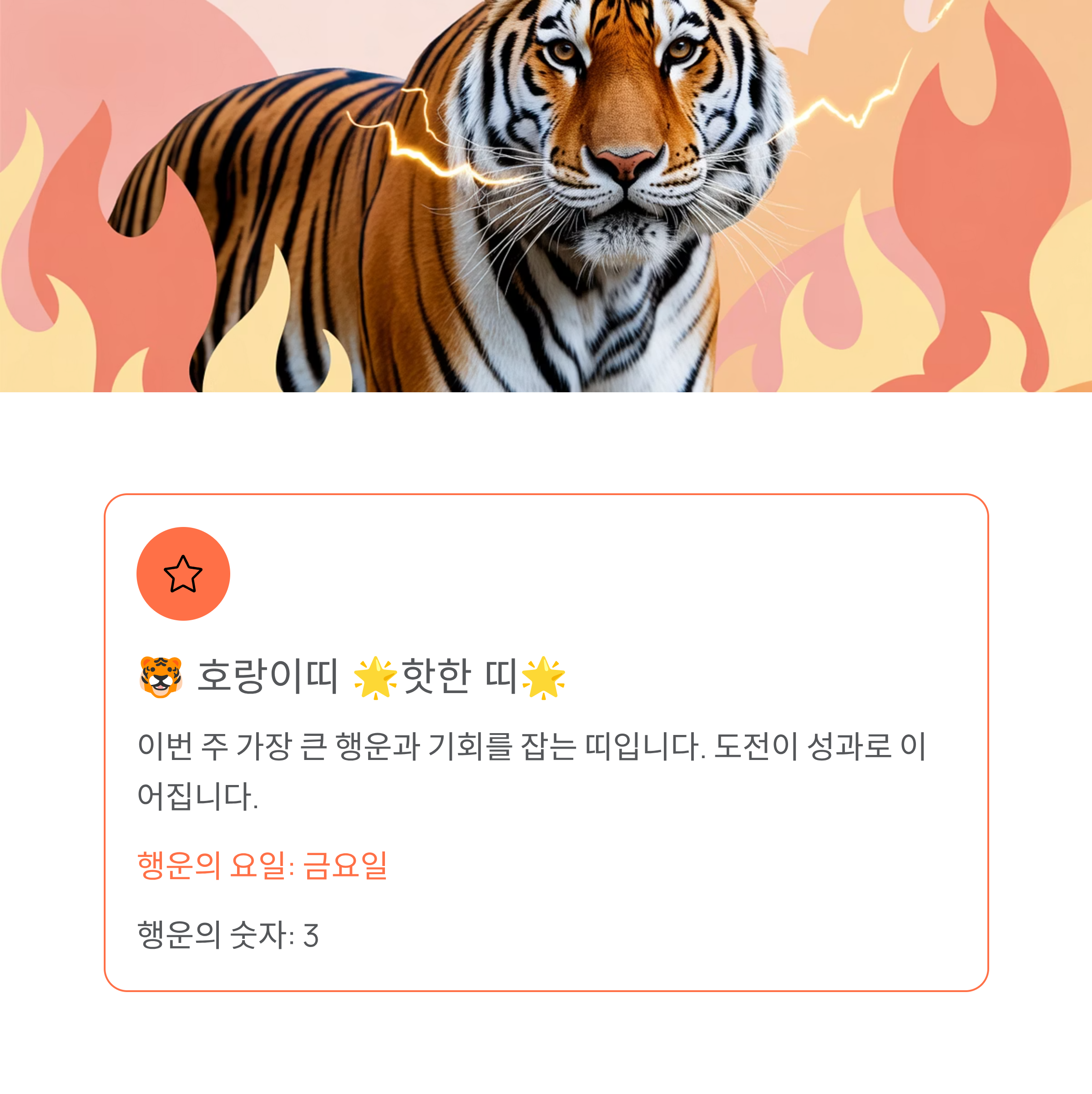 특히 이번 주 가장 핫한 띠는 호랑이띠로, 과감한 도전과 행운이 크게 들어옵니다.