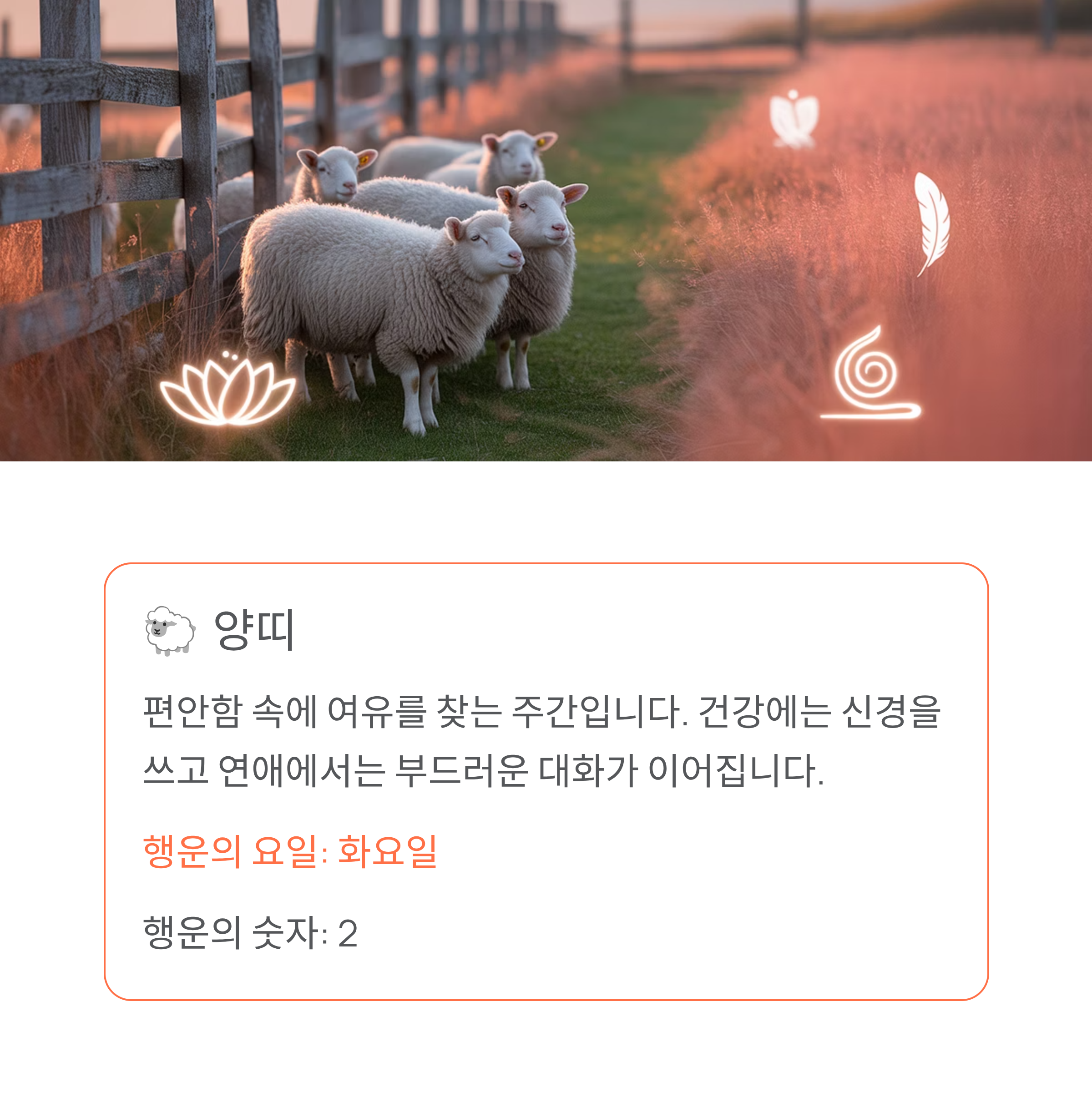연애운과 재물운이 균형을 이루며 건강과 인간관계에서도 안정적인 기운이 흐릅니다.