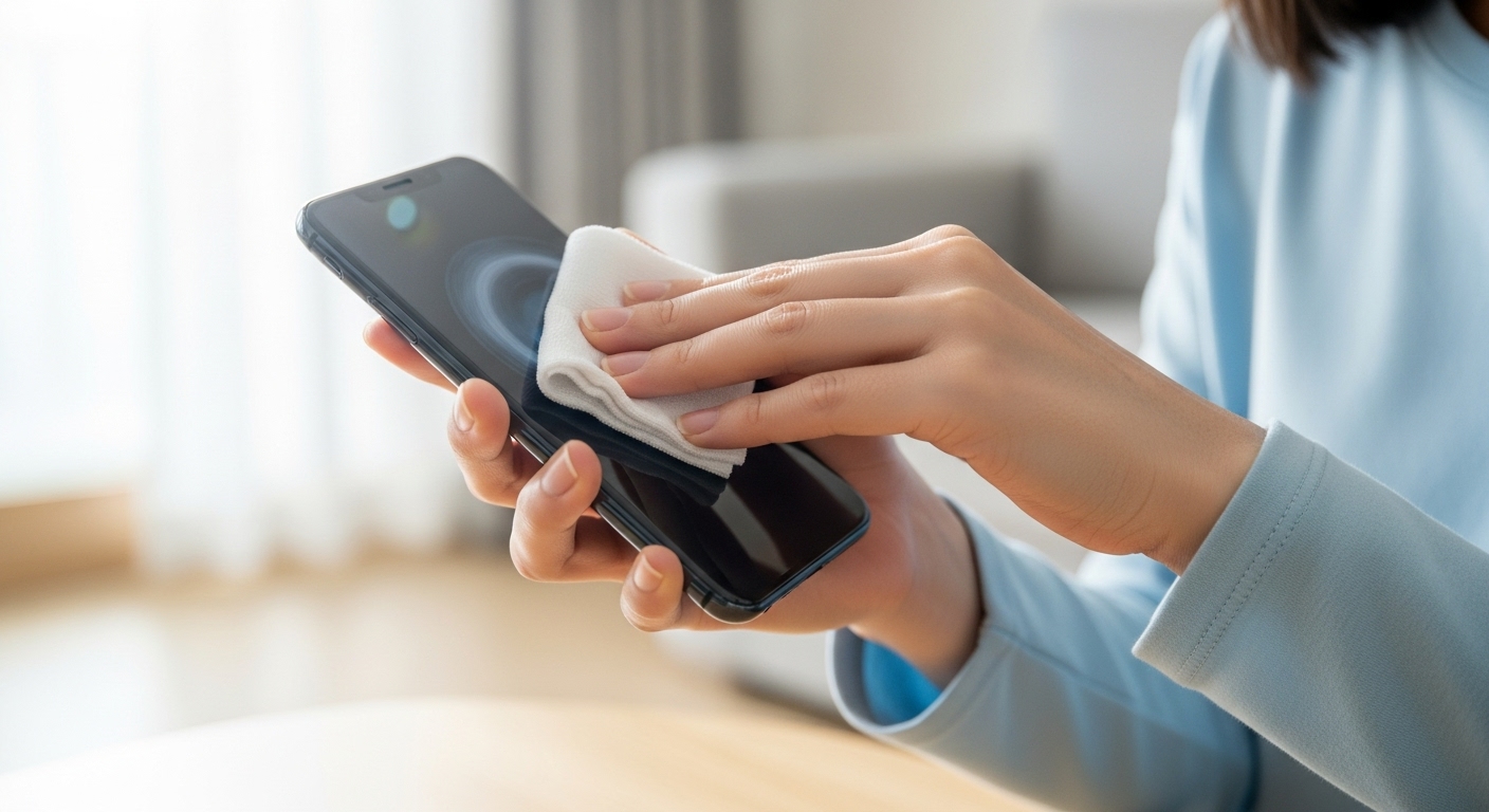 스마트폰을 깨끗하게 닦는 모습이에요.