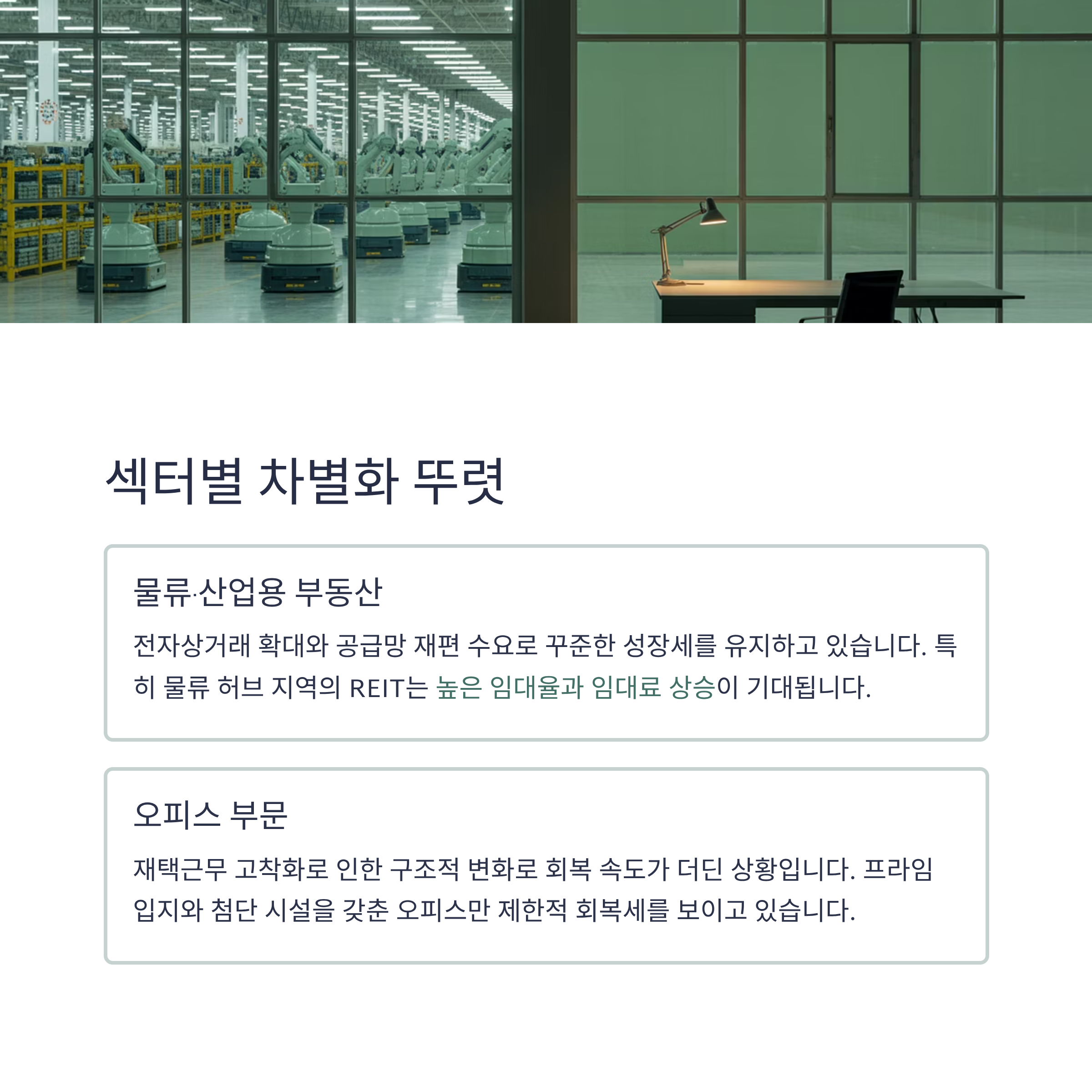 | 오피스 | 회복 지연 | 입지 선별 중요 |