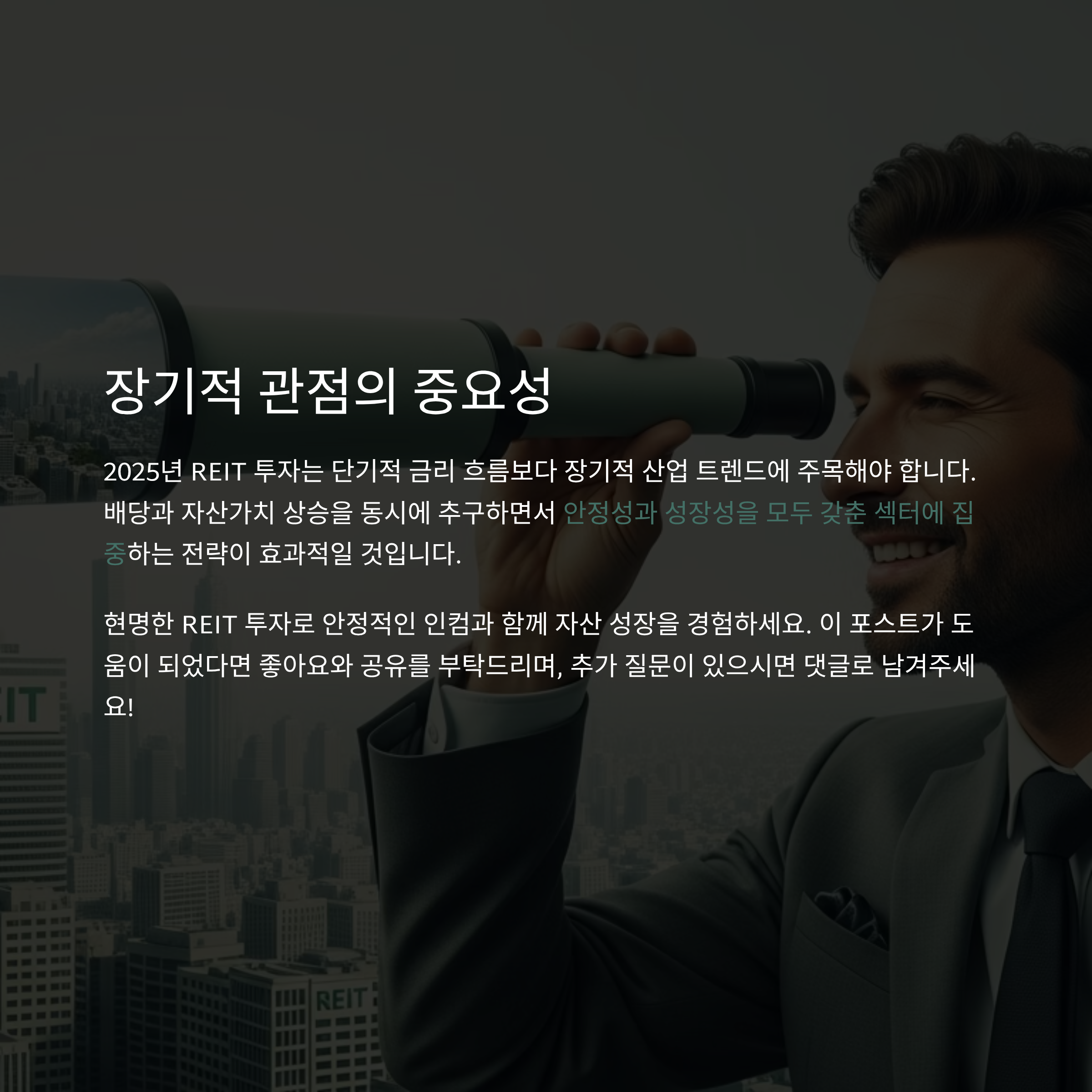 2025년 REIT 투자는 단기적인 금리 흐름보다는 장기적인 산업 트렌드를 바라보는 것이 중요합니다.