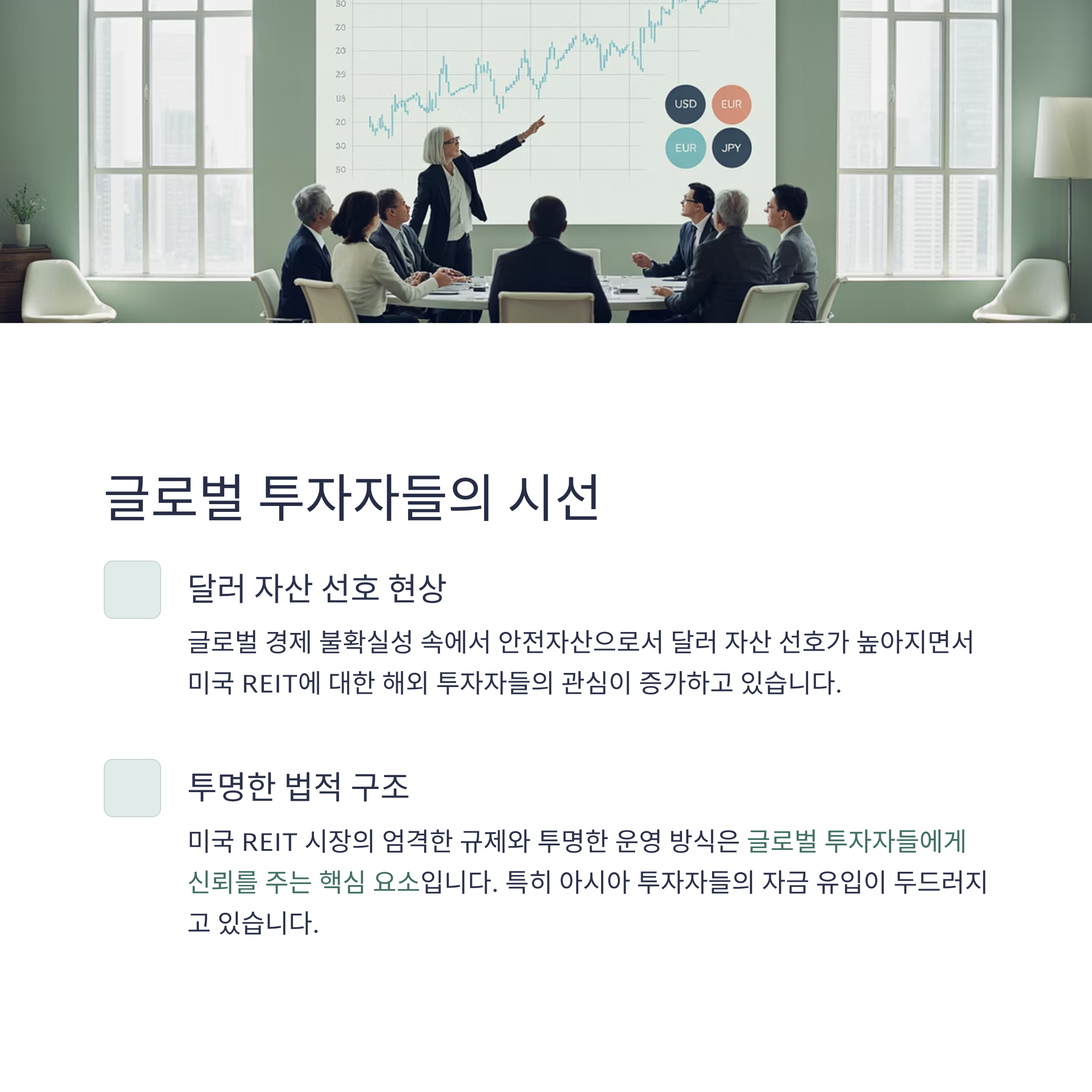 네, 미국 REIT는 법적 안정성과 투명성이 높아 글로벌 자금이 꾸준히 유입되고 있습니다.