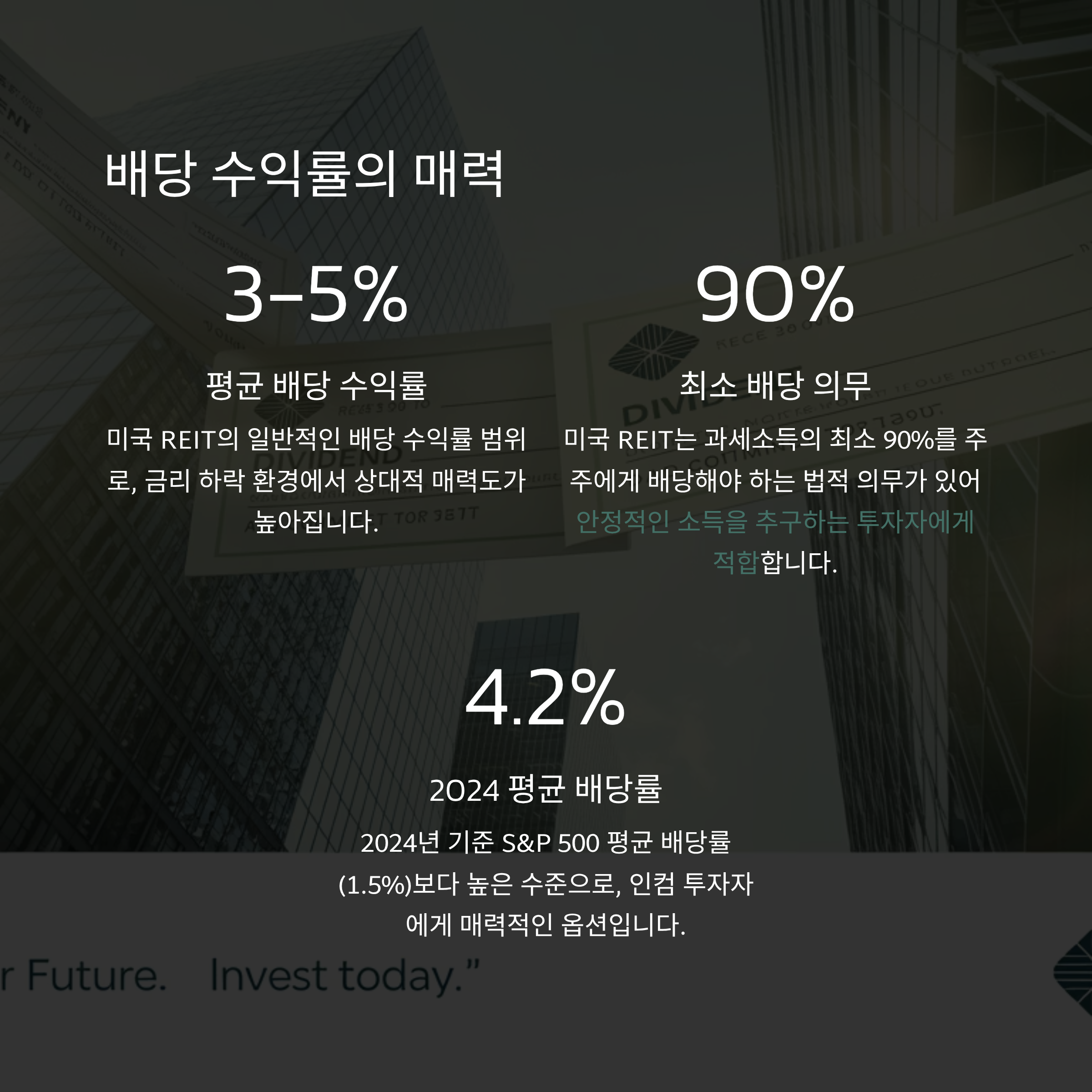미국 REIT의 평균 배당 수익률은 3~5% 수준입니다. 금리 하락 시 채권 대비 매력이 높아져
