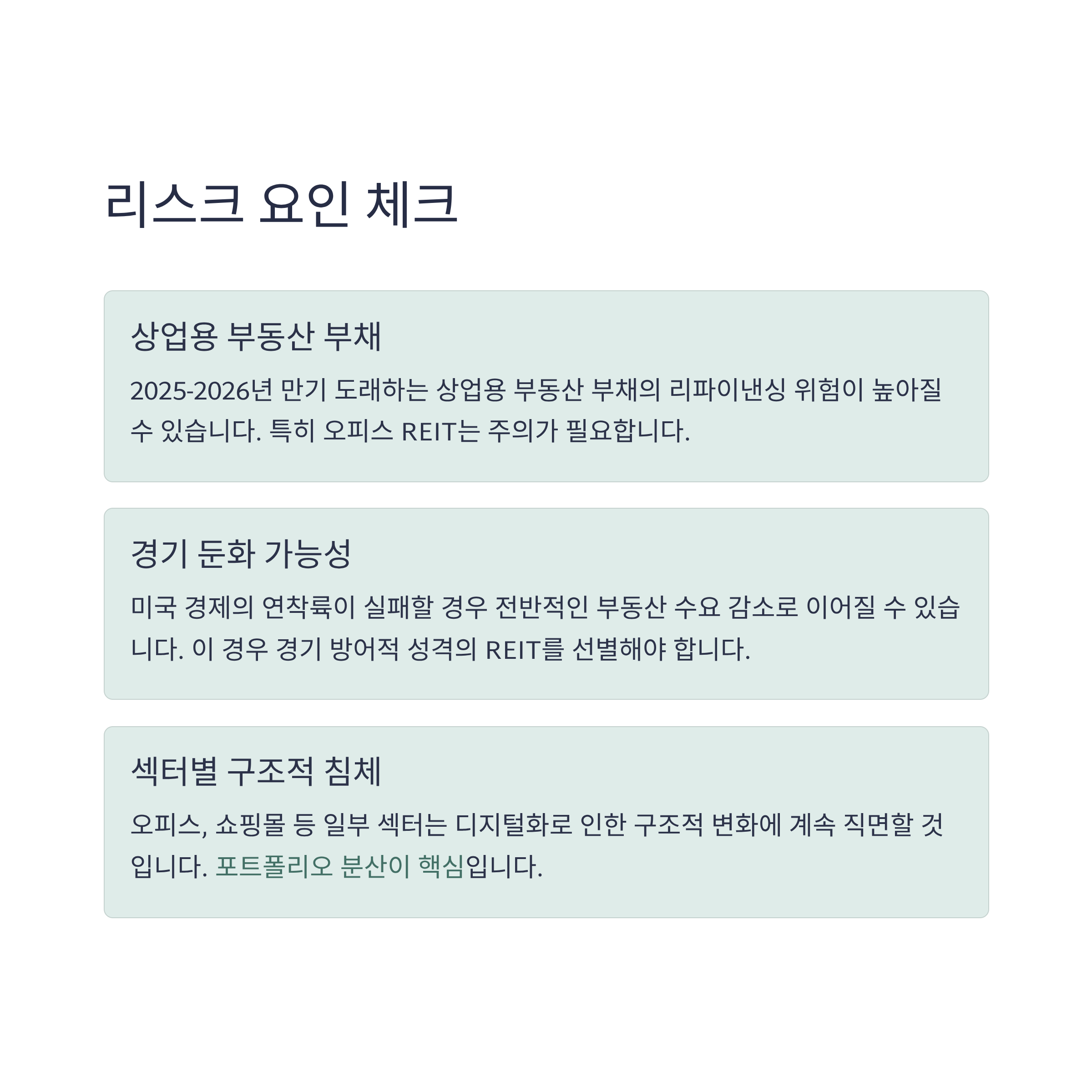 오피스 부문 회복 지연, 경기 둔화, 상업용 부동산 부채 부담이 주요 리스크입니다.